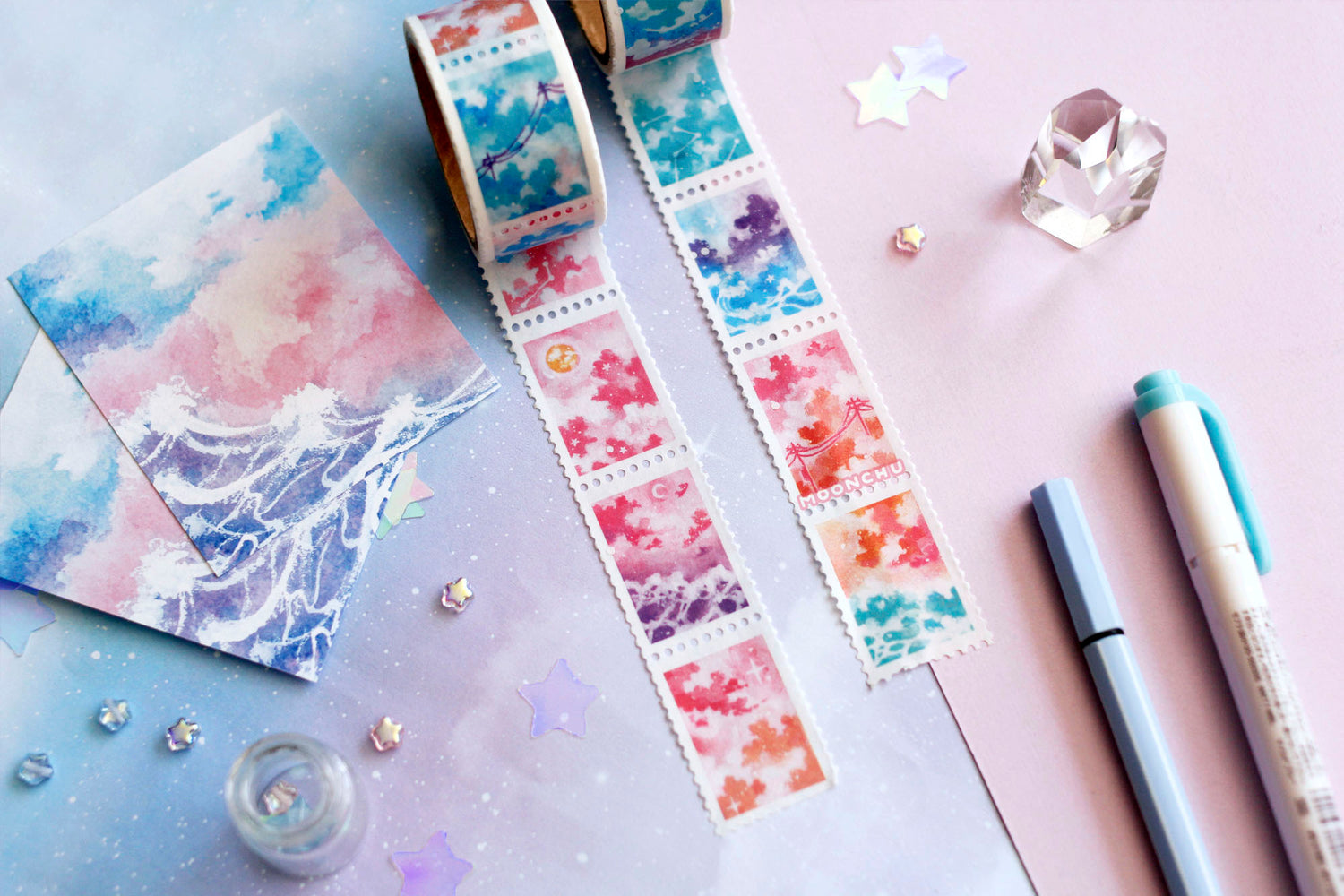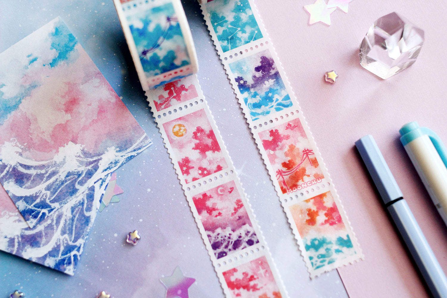 this dreamy pastel stationery is based off of original watercolour paintings and features several starry skyscapes, magical oceans, and cloudy sunsets.