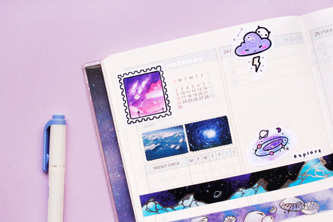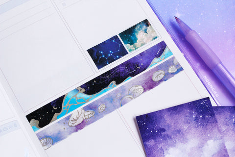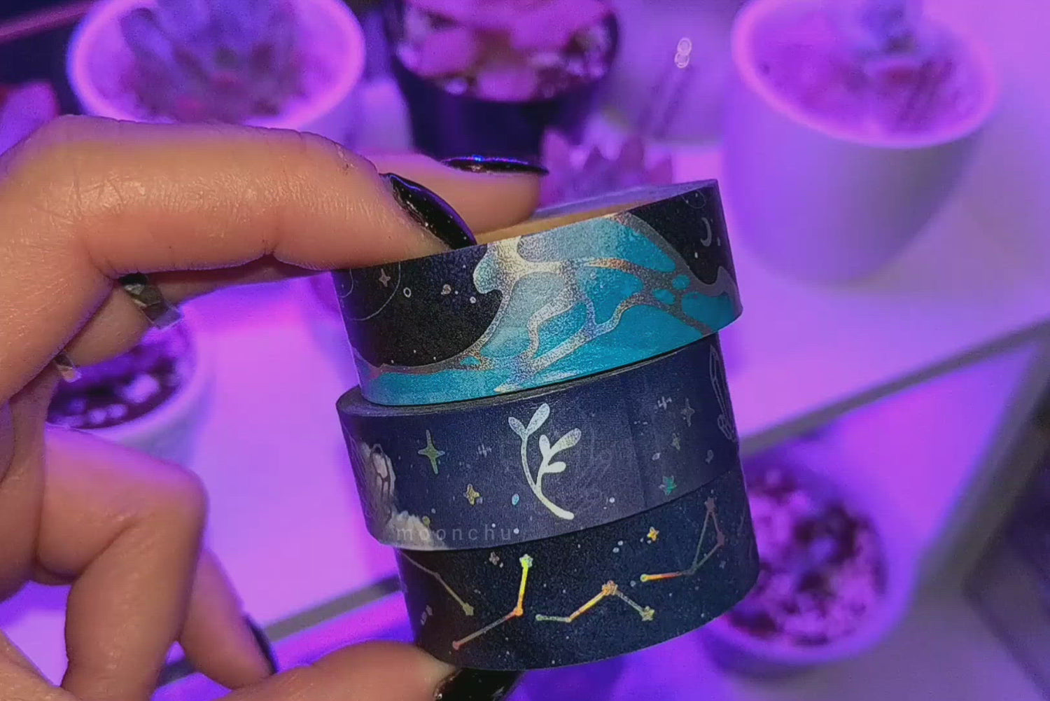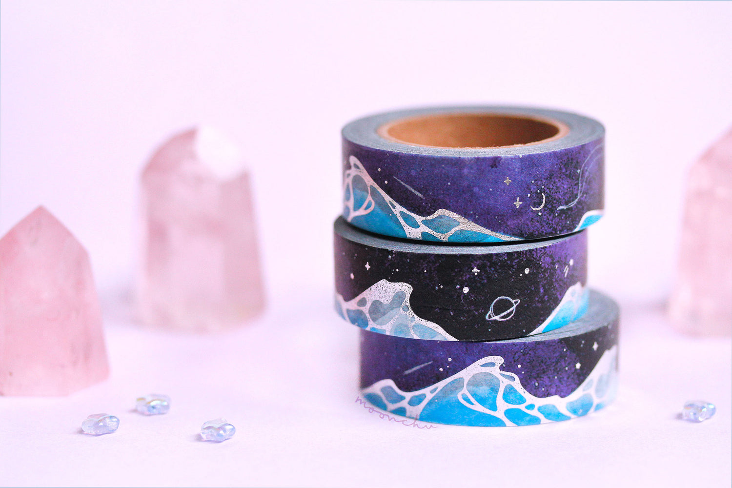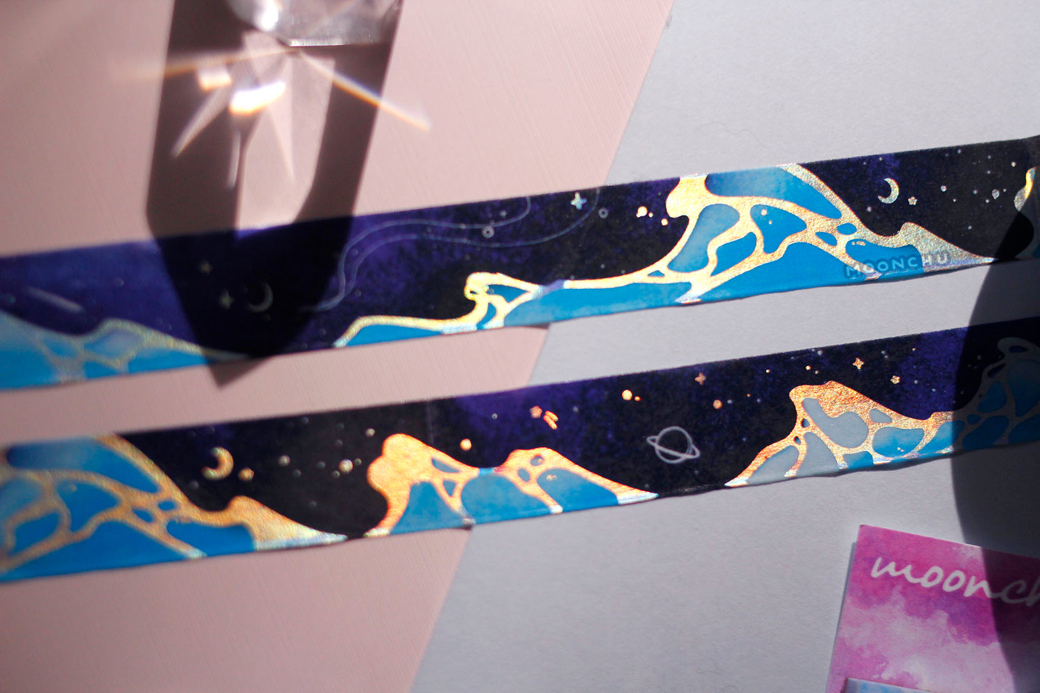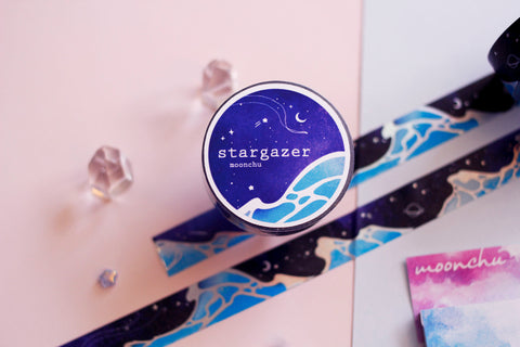 laying out upon the grass or beach, staring up into the night sky and dreaming of anything and everything. "stargazer" exemplifies this feeling, with its cosmic nightscape and tidal wave foil accents.