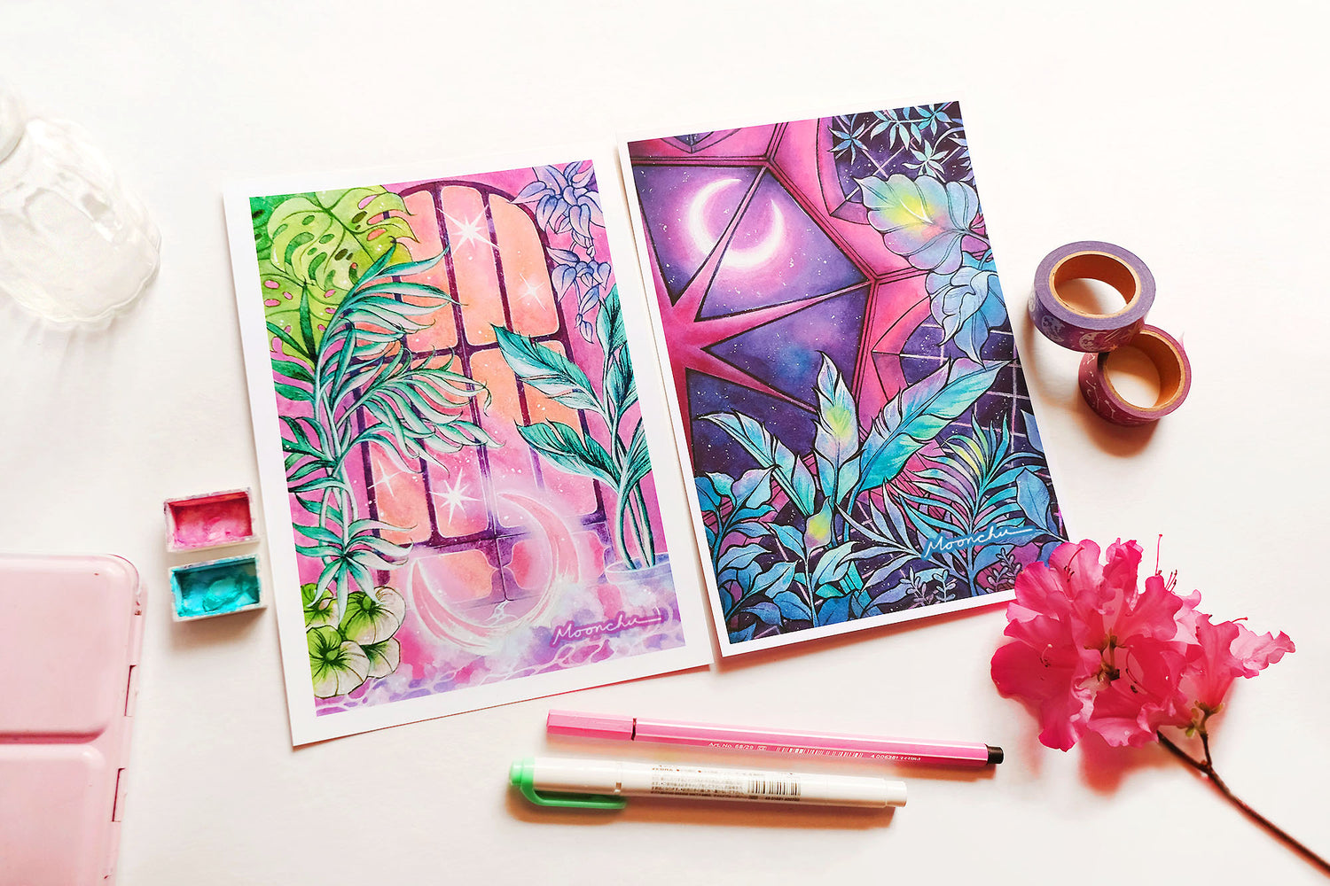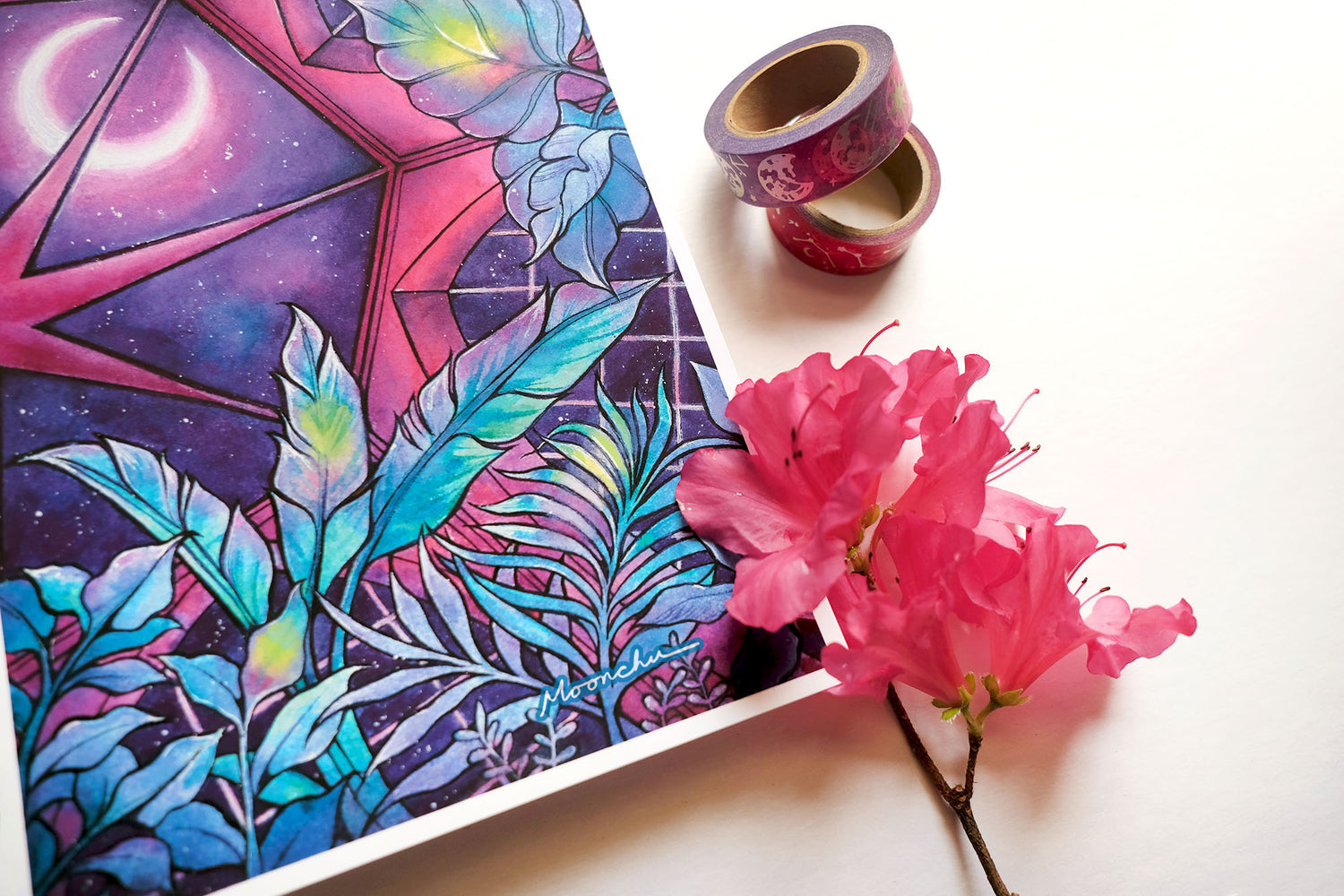 whimsical, lush botanical garden art print of a moonchu original painting.