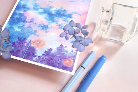 there are soft pink and tangerine brushstrokes, purple bushes, and two streetlamps.