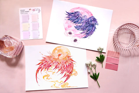 learning to balance stubbornness and confidence to achieve what you desire, yet slowing down to appreciate what spring has to offer anew, this painting depicts a beautiful rising phoenix against a warm-toned full moon.