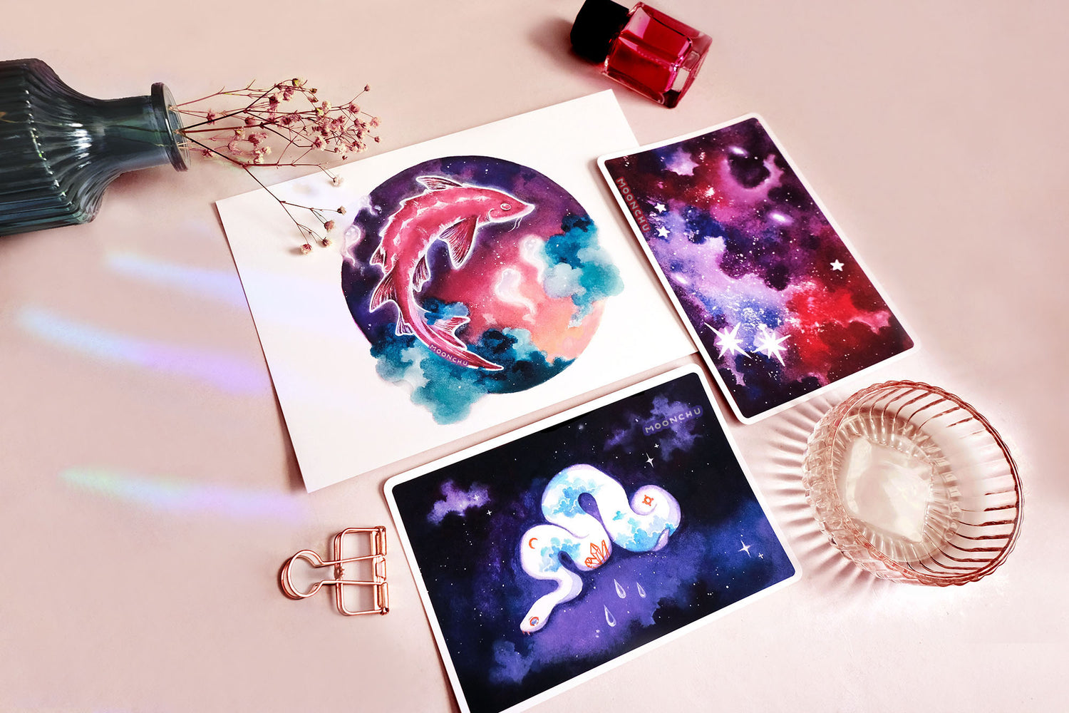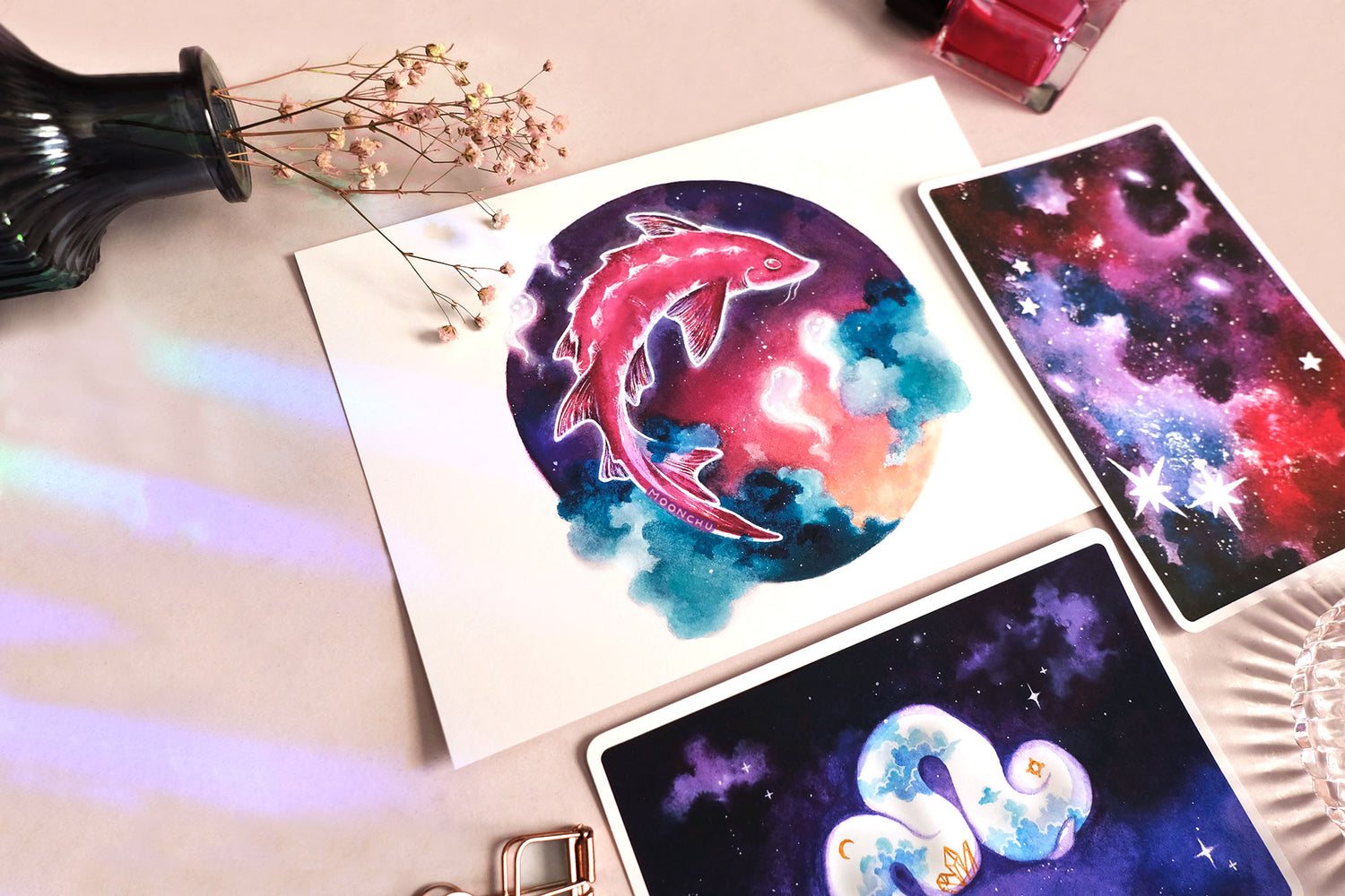 this fish-inspired mystical moon art print is based off of an original mixed media painting.
