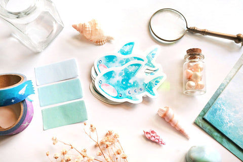 my ocean lover heart adores whale sharks, so i had to make yet another whale shark vinyl sticker. this pastel decal has accents of constellations, moon phases, and a blue planet. merging space lovers and shark friends alike, this moonchu original art watercolor sticker is a sweet addition to any ocean-themed planner, summer scrapbook, water bottle, etc.
