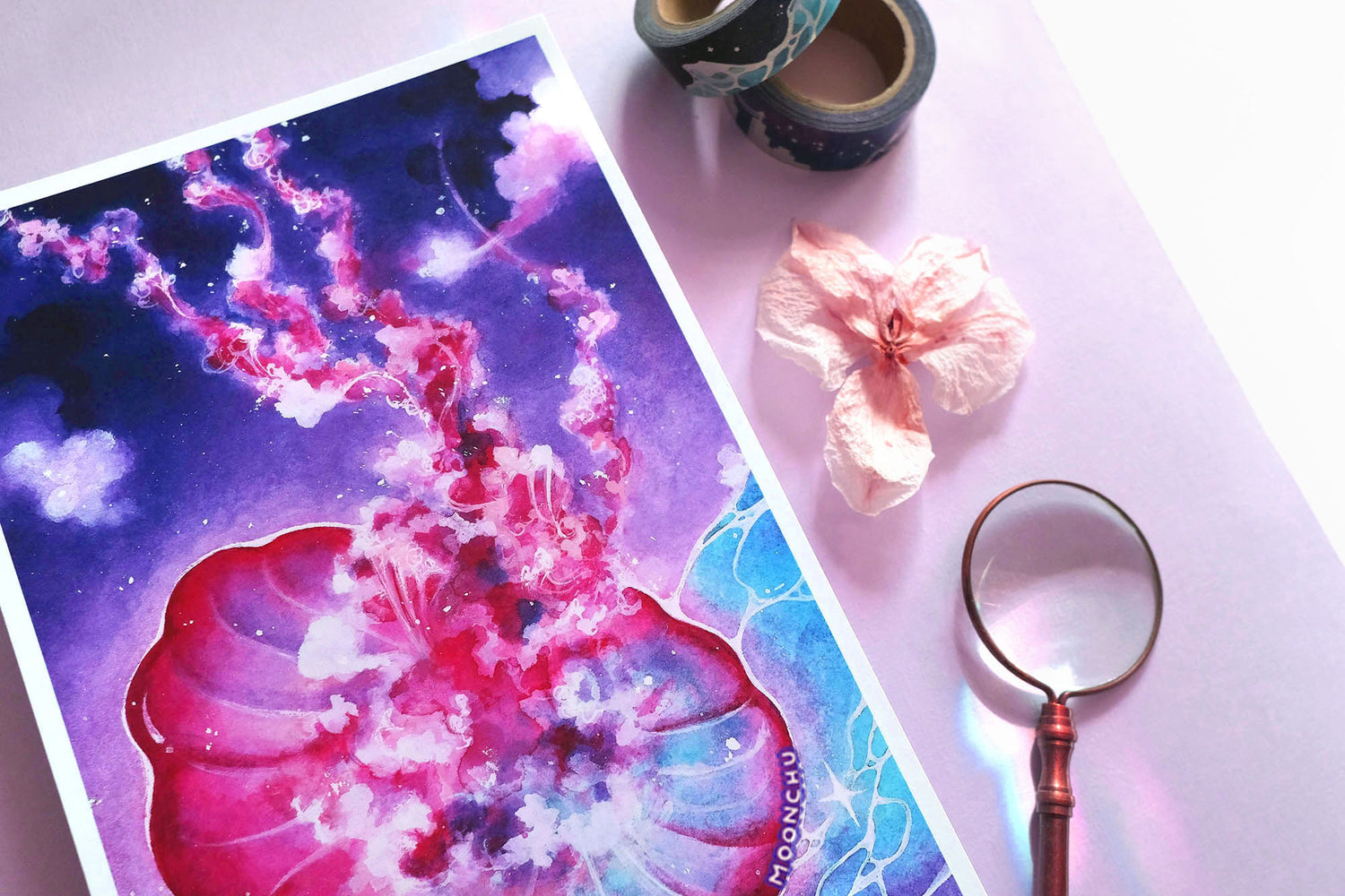 this refreshing art print depicts a beautifully vibrant, red jellyfish with lacey tendrils splashing into a teal ocean against a rich blue-purple gradient background.