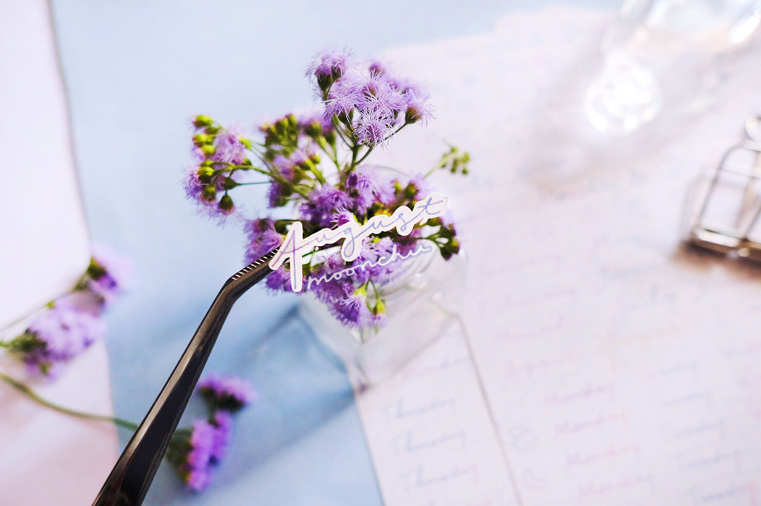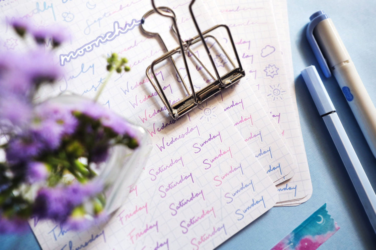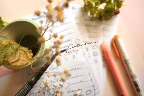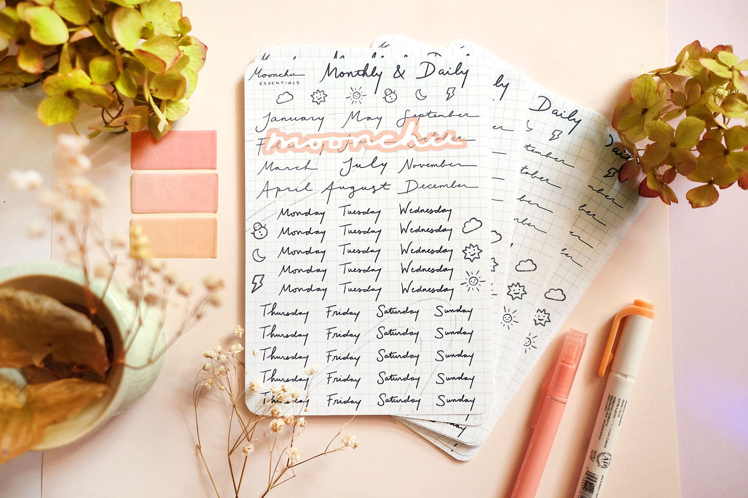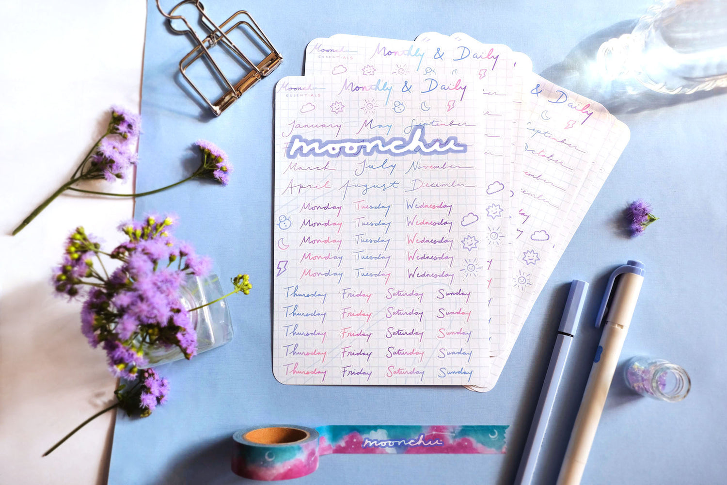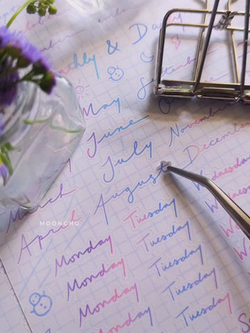 an elegantly unique, thin, italicized cursive script typography sticker sheet (what a sentence) detailing months of the year and days of the week for all of your essential planner productivity needs. also has little weather icon stickers to depict your mood or the weather in your planner or bujo.