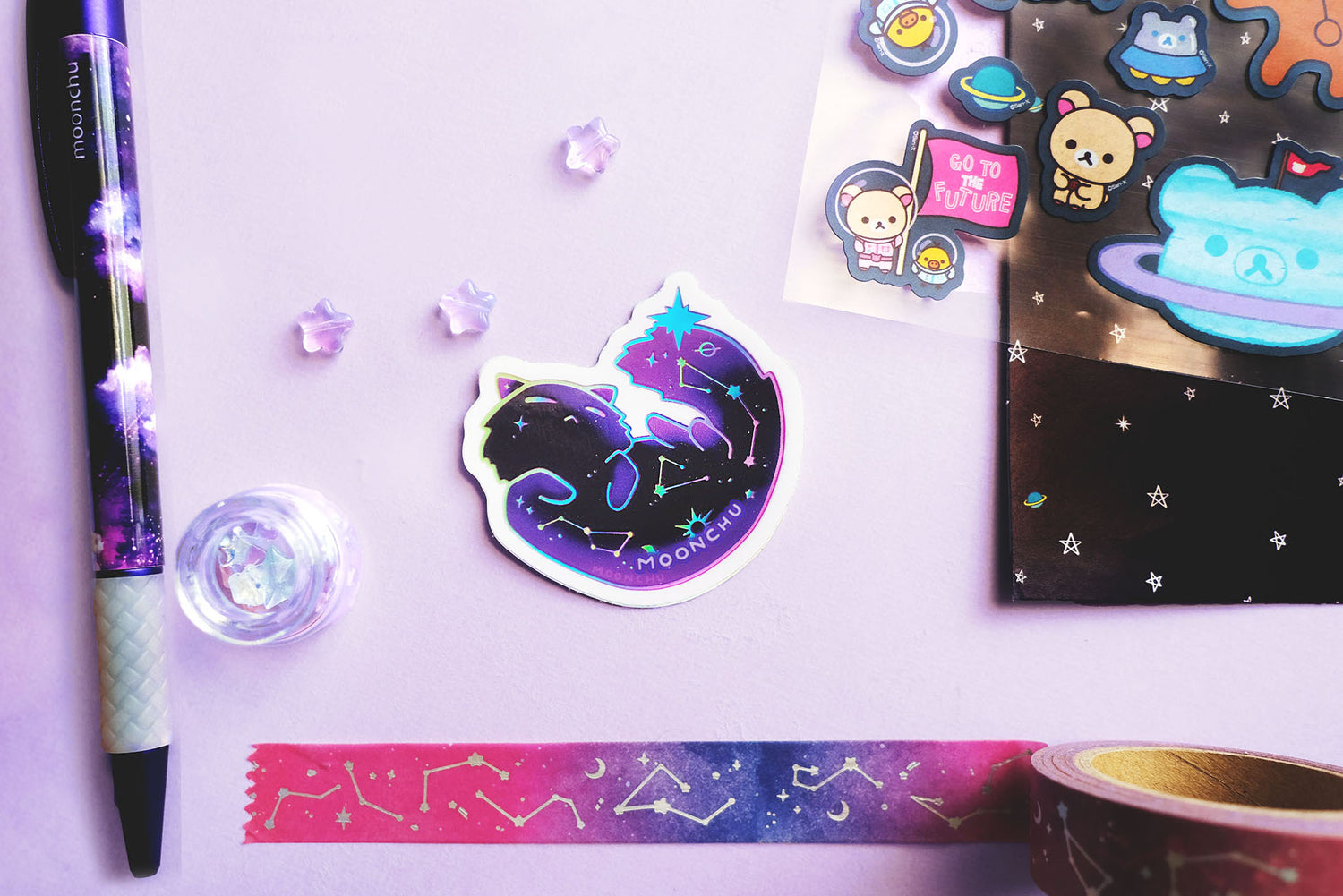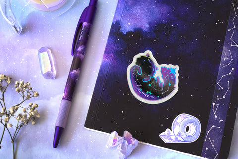 this celestial kitty rests on a white base and is accented with holographic flashes (looks quite beautiful in various lighting). these stickies can bring a bit of every day magic to your water bottles, laptops, or just hanging out on your desk as a mystical reminder.