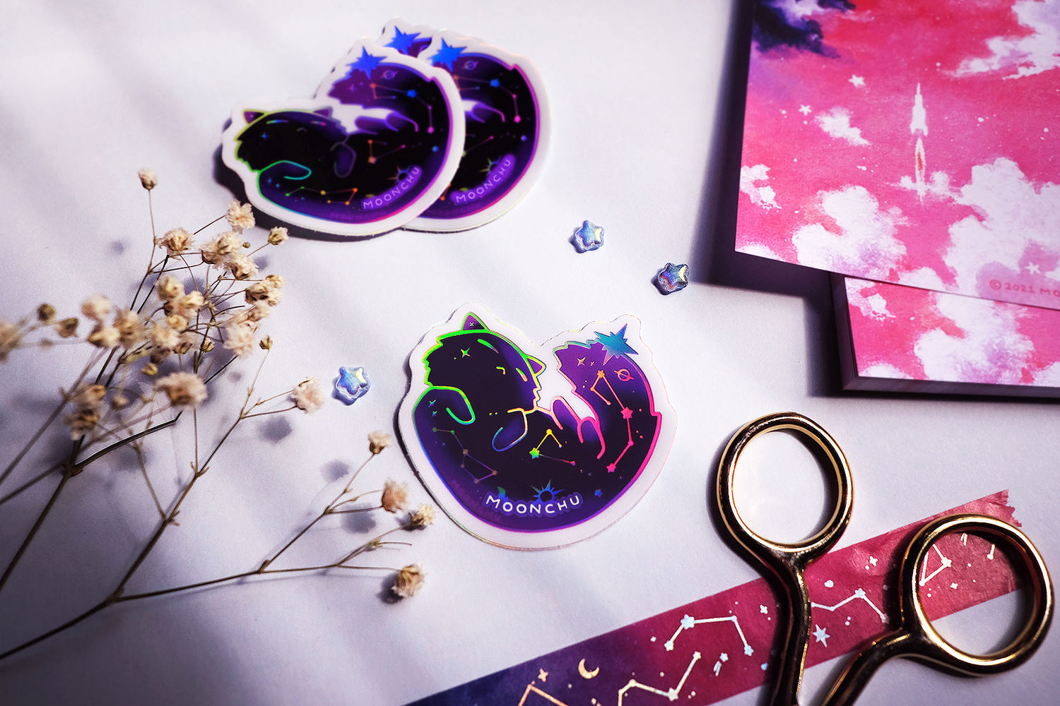 constellation cat sticker, space cat sticker, galaxy cat holographic die cut vinyl sticker