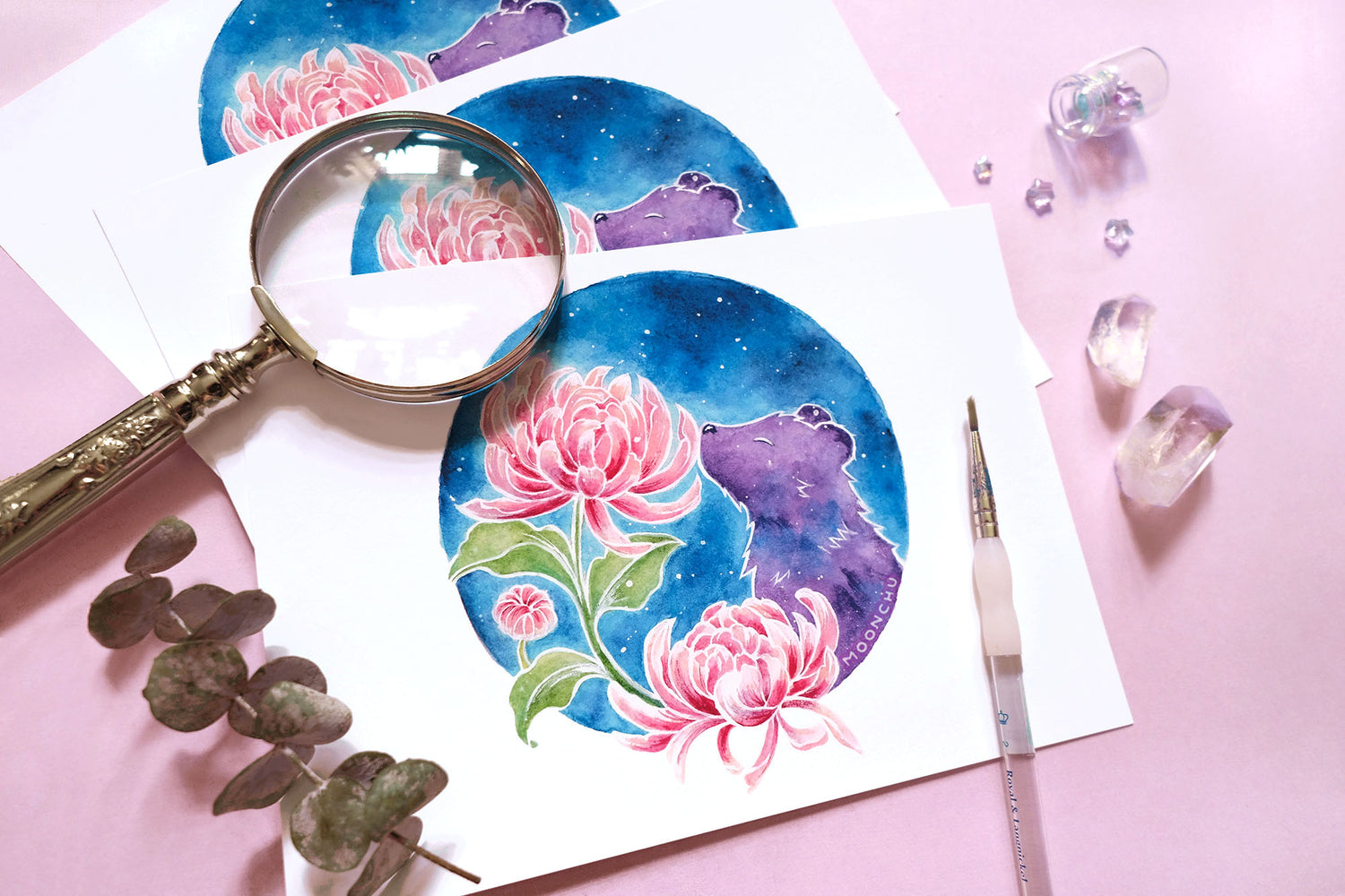 february's snow moon bear art, chrysanthemum art, A5 watercolour art print