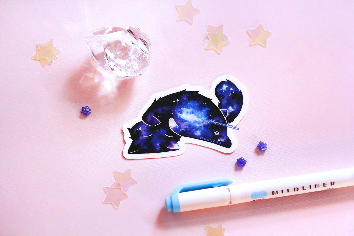 galaxy kitty [3" length] is my cat's favourite way of sleeping - flopped on his back. this kitty has a vaporous galaxy on his belly.