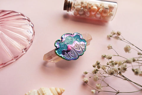 though this rainbow anodized pin may look small, it's kind of a BIG deal. the biggest bivalve in the world, actually! this is my ode to the gigas giant clam, as i love catching them in AC:NH. oh, to be a mermaid underwater and see this in real life - but now, you can have a miniature clam shell in your pocket in the form of this brooch.