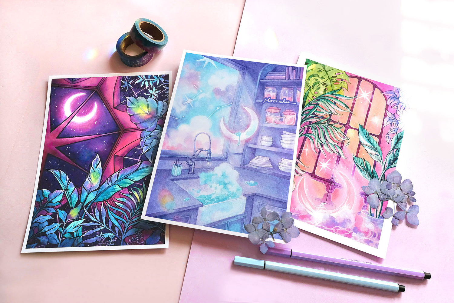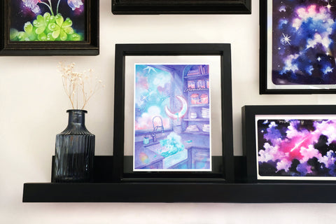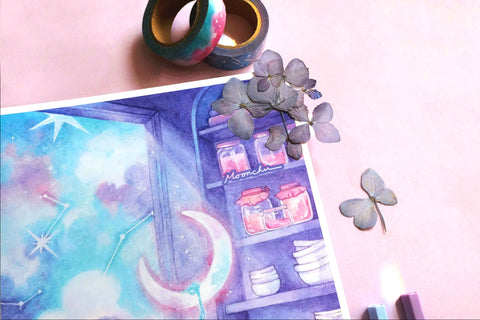 a pastel purple and blue surreal art print depicting a magical kitchen, constellations, crescent moon, and tidal wave.