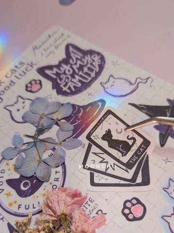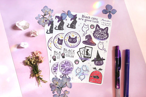 for those of you who adore and love black cats and think that they're magic, this original art sticker sheet is for you. black cats are good luck, and deserve to be celebrated like all other kitties. show your love of black cats, ESPECIALLY during halloween, by sticking these cuties in your planner/bujo/hobonichi !
