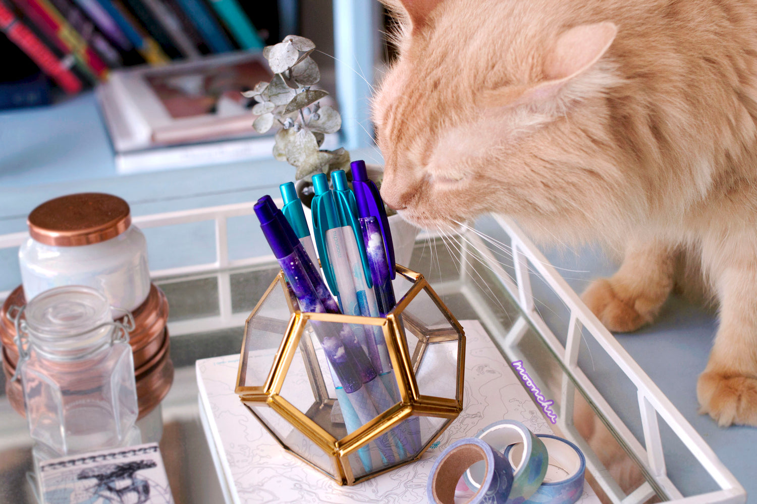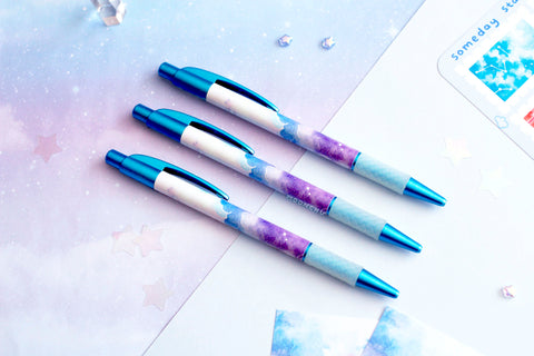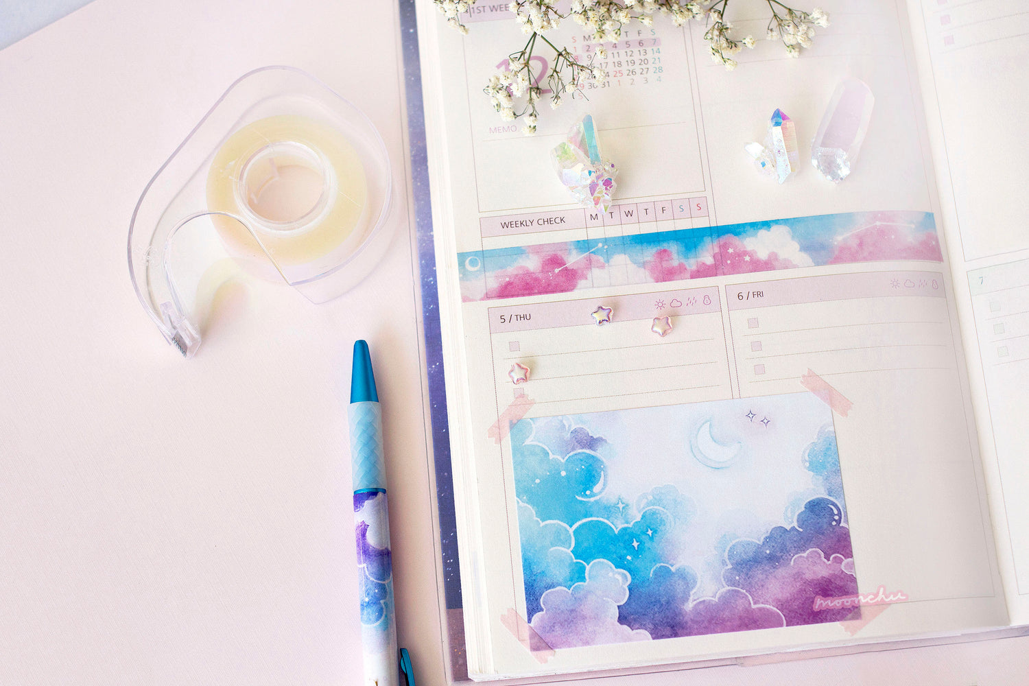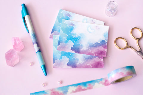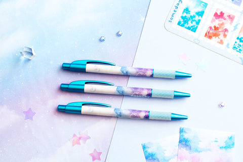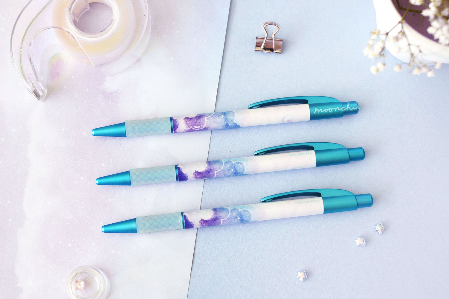 i turned an original watercolour painting into a cool pen! this dreamy little pen depicts some fluffy cool-toned clouds with a sweet little crescent moon .