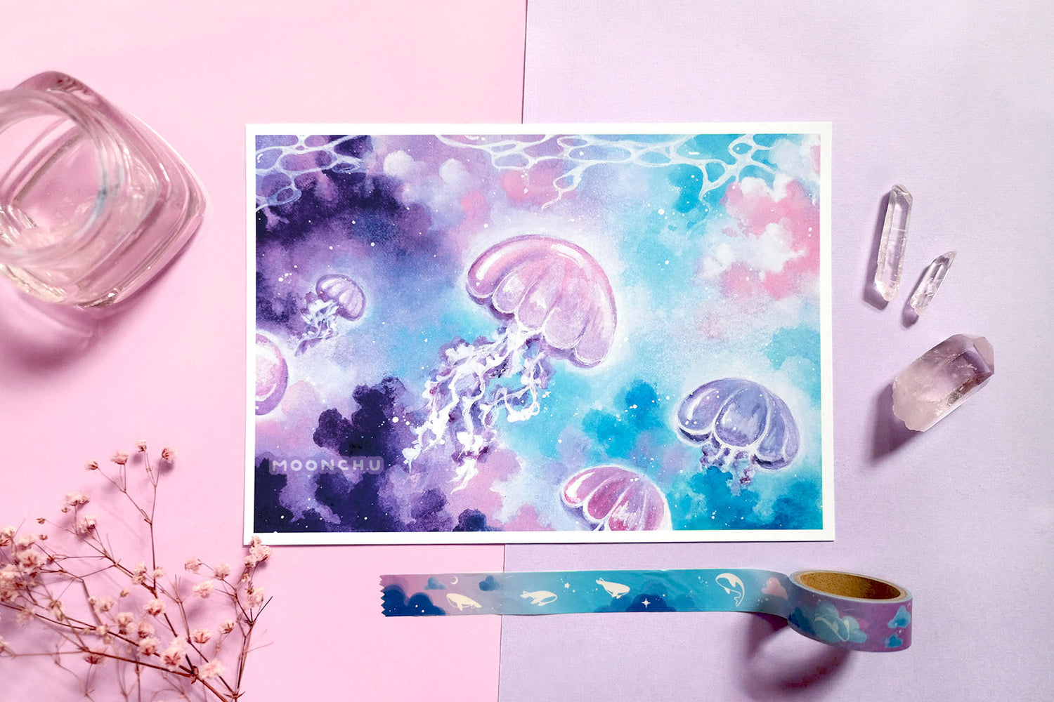 a soothing and serene art print to whisk you away on a nautical journey with these jellyfish.