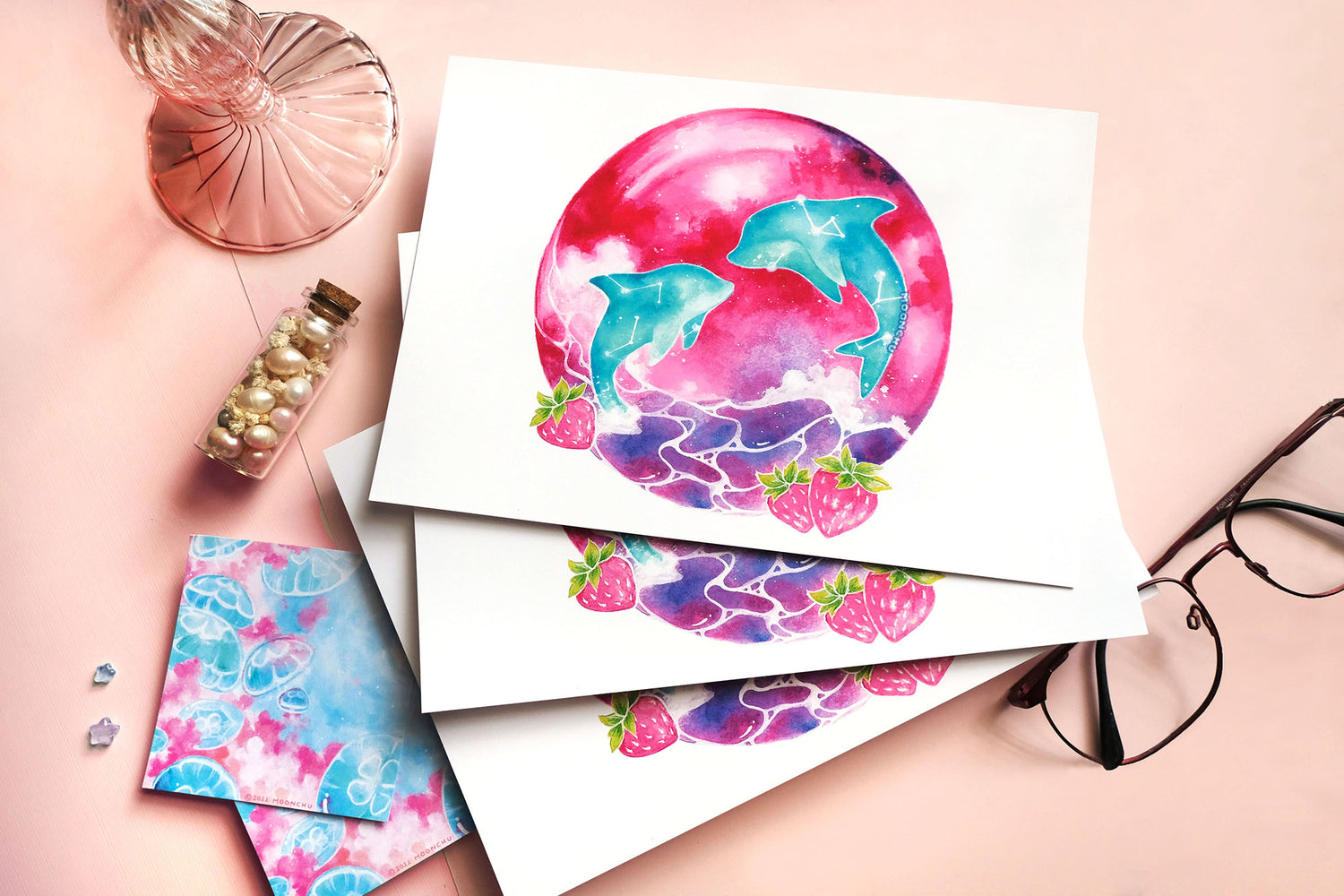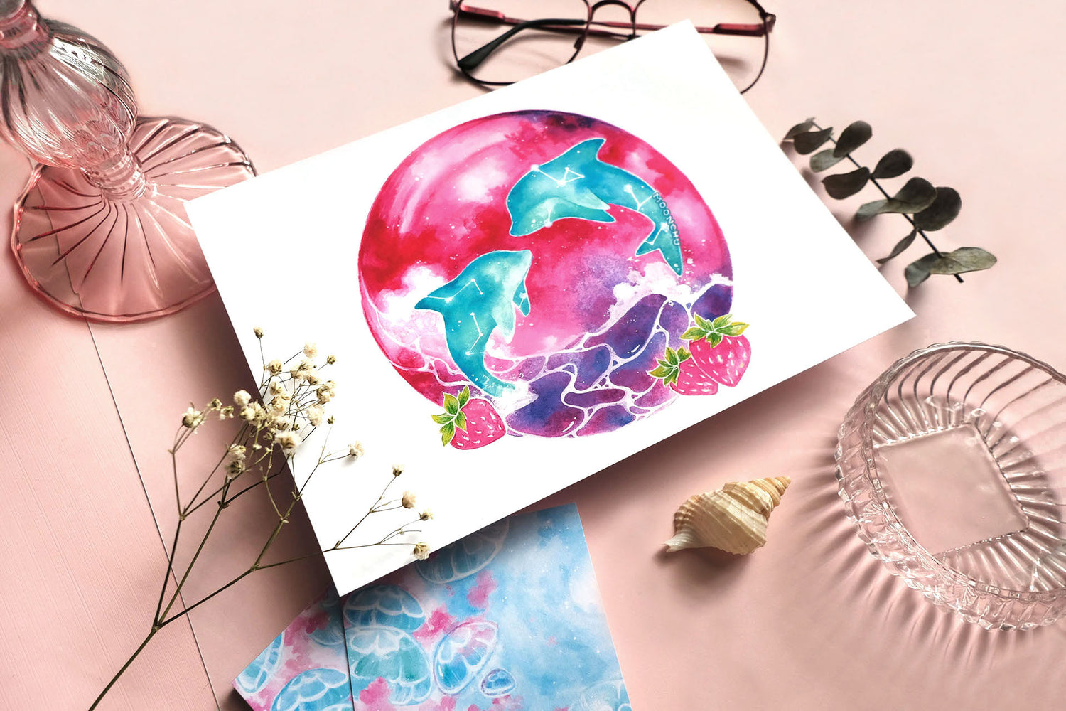june's strawberry moon, dolphin art, A5 mixed media art print
