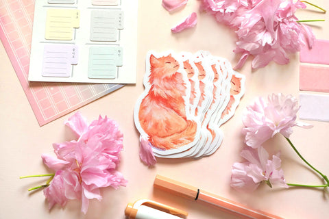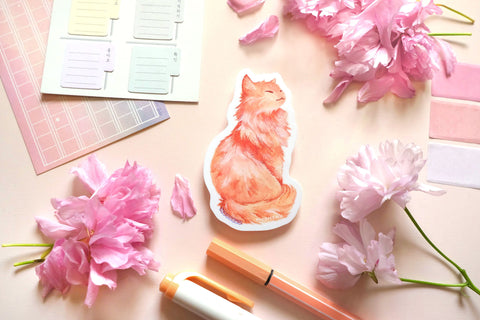 inspired by one of my favourite photos of my cat and loml. this vibrantly glossy die cut vinyl cat sticker is based on an original watercolour painting by moonchu.