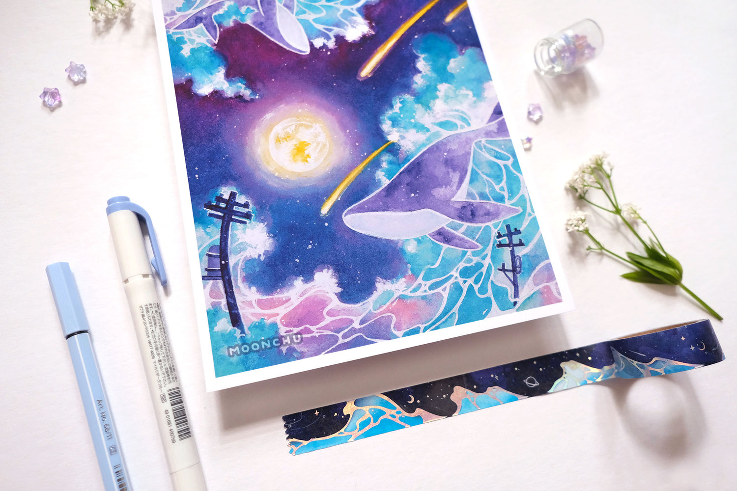 based off of an original watercolour painting depicting graceful whales, shooting stars, ocean waves, and a luminous moon. a serene art piece addition for any ocean lover, or potentially a soothing gift for someone going through a difficult time.