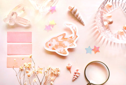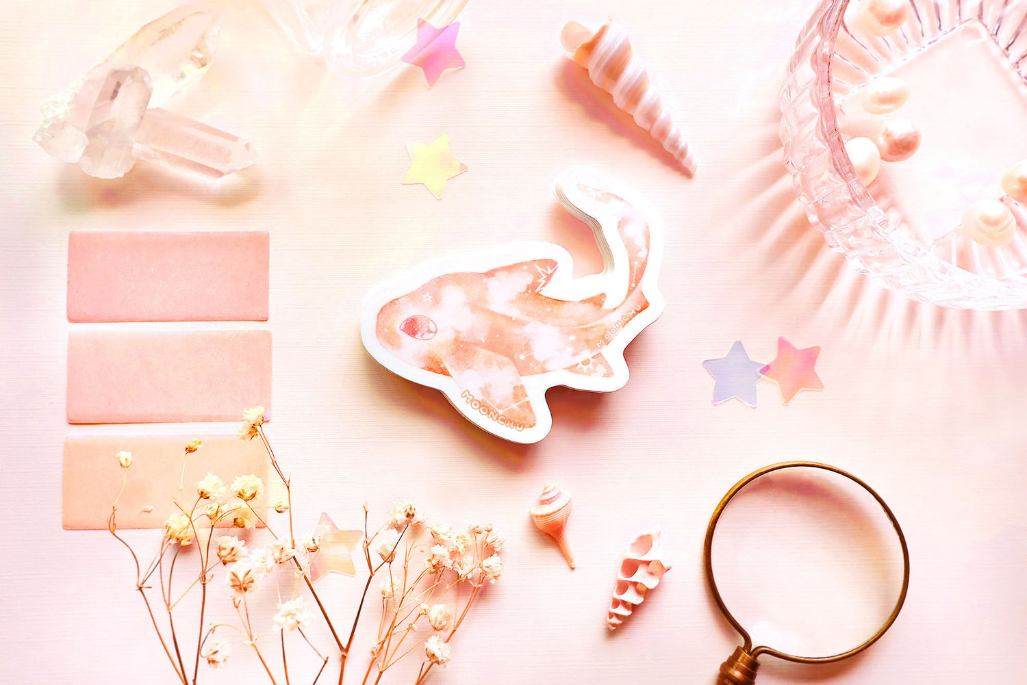 this original art sticker depicts a pastel orange leopard shark, based off of a moonchu watercolor painting. little white clouds, stars, and constellations accompany this sweet sky shark on its journey. a waterproof vinyl sticker to show that you are a shark friend! great to commemorate your summer in a scrapbook, a pastel planner, ocean creature themed laptop, etc.