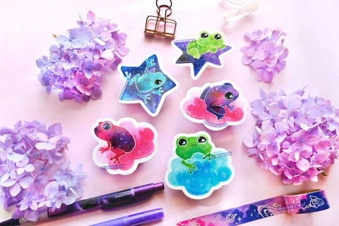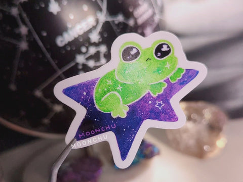 little green frog blasting off to space on a star die cut vinyl sticker, original frog art