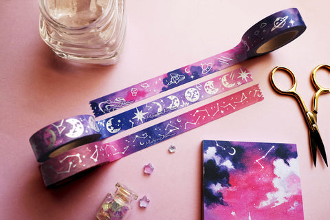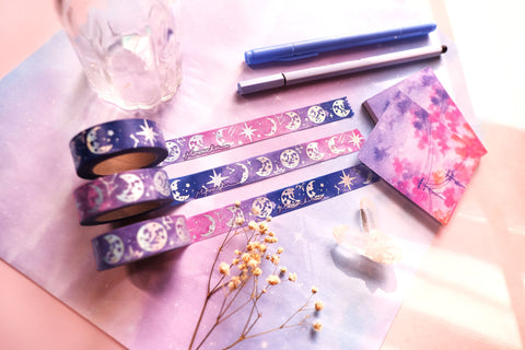 it was only a matter of time before i came out with a moon-based washi tape. by the ever-changing facets of the moon, this washi tape shimmers with comets and constellations.