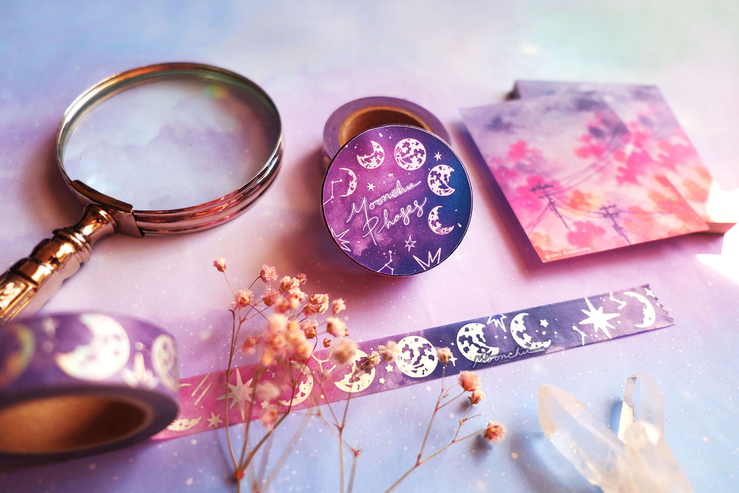 derived from an original moonchu watercolour painting of rich blue gradients to sweet pink-lavender skies, this stationery is a great addition to any celestial planner, astronomy bujo, scrapbook, etc.