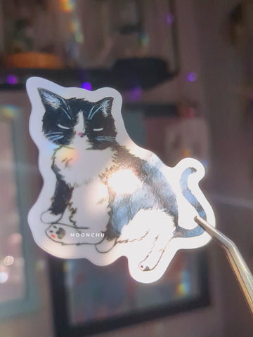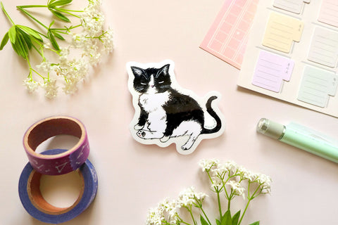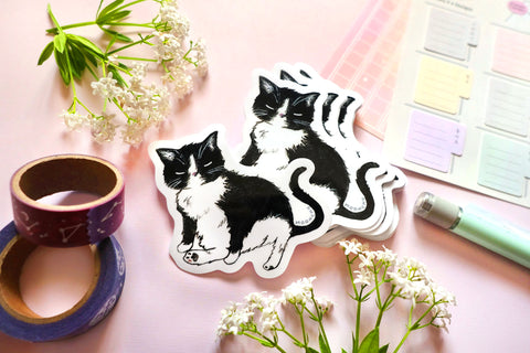 this vibrantly glossy vinyl black cat sticker is based on an original watercolour illustration by moonchu.