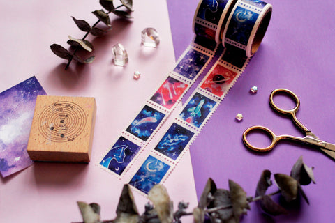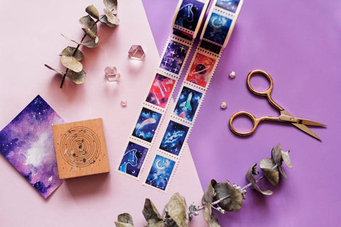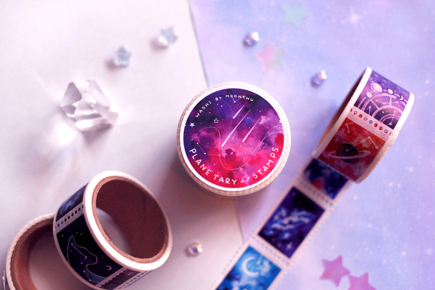 this cosmic space stationery is based off of original watercolour paintings and features moon phases, rockets, planets, a plethora of shooting stars, and a mystical cat space traveler.