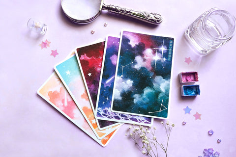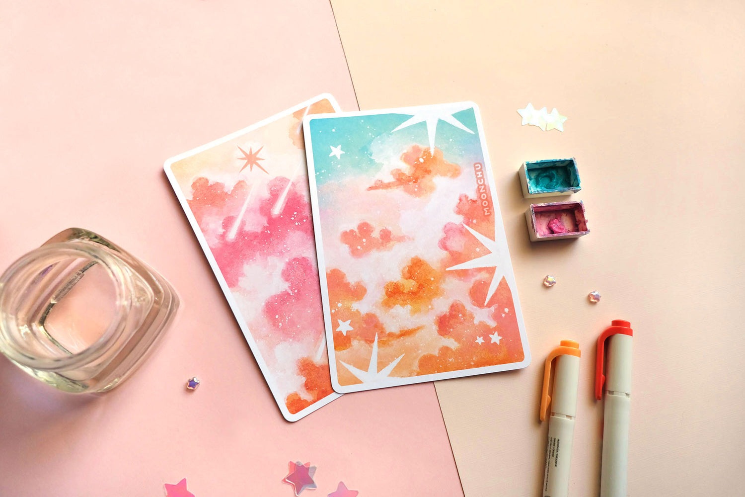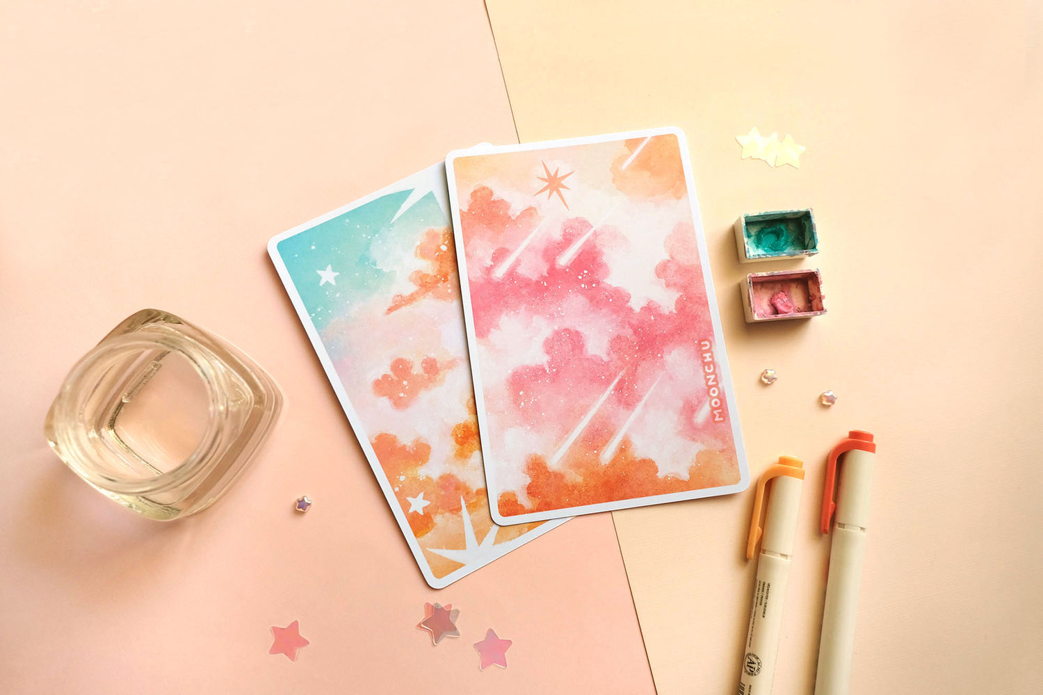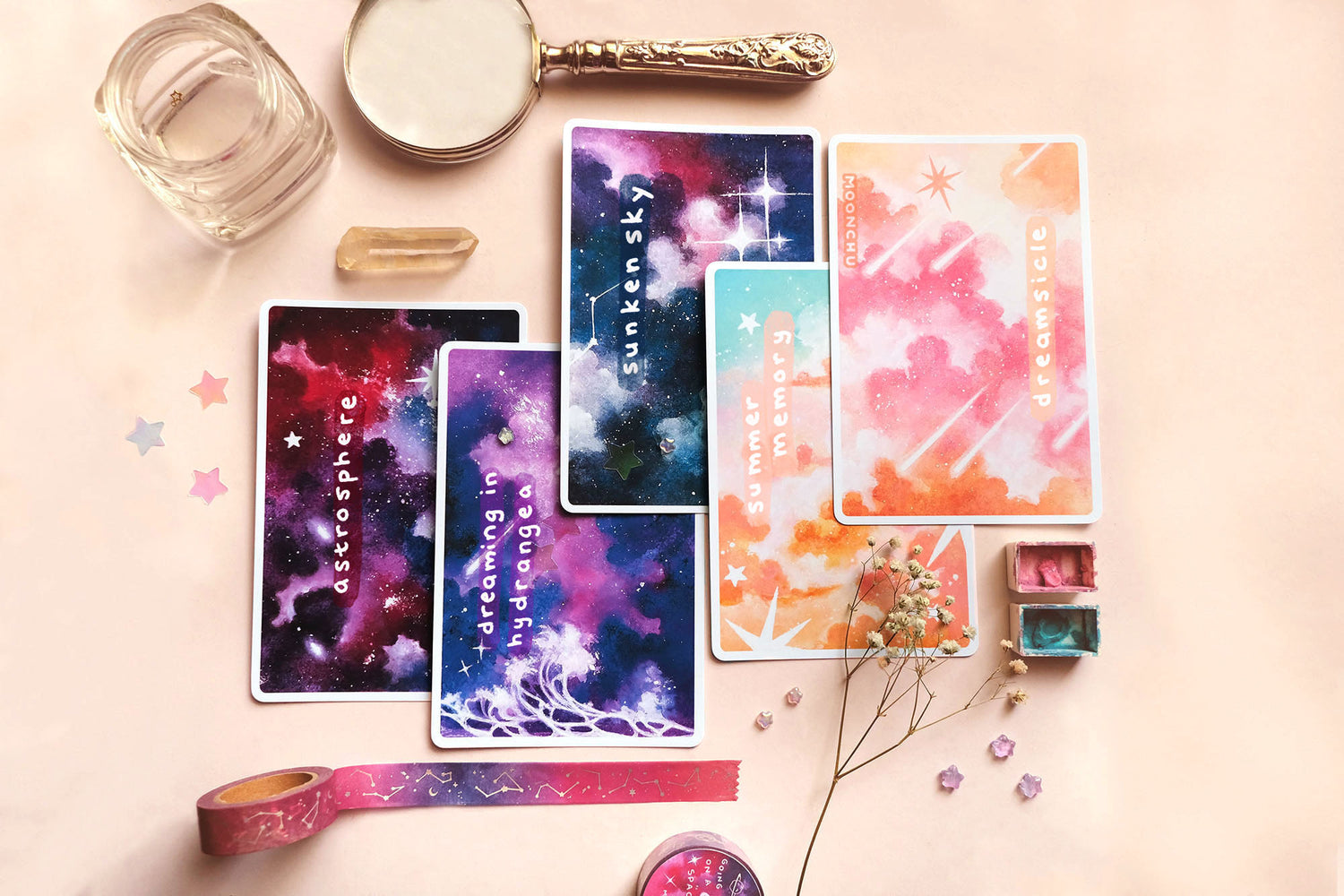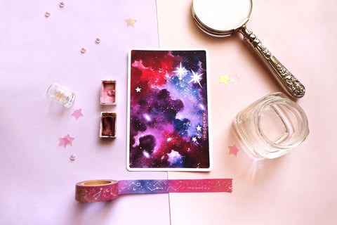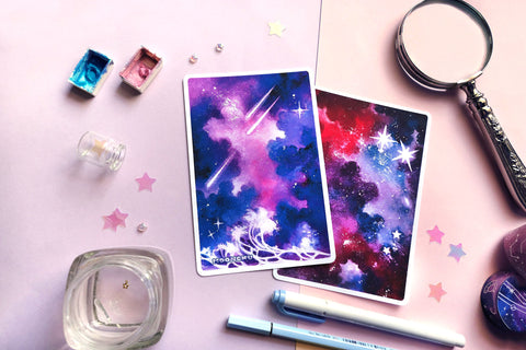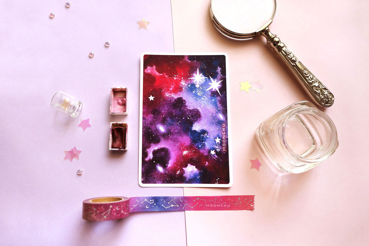 whimsical art prints of original moonchu mixed media paintings! inspired by nature landscapes, sunrises and night skies, these galaxy paintings would provide a nice respite in an office space or gallery wall - or you could send them to someone that you're missing.