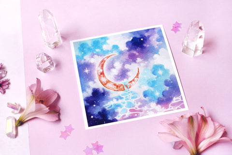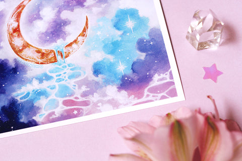 rivulet, ocean moon art, crescent moon art, watercolour art print