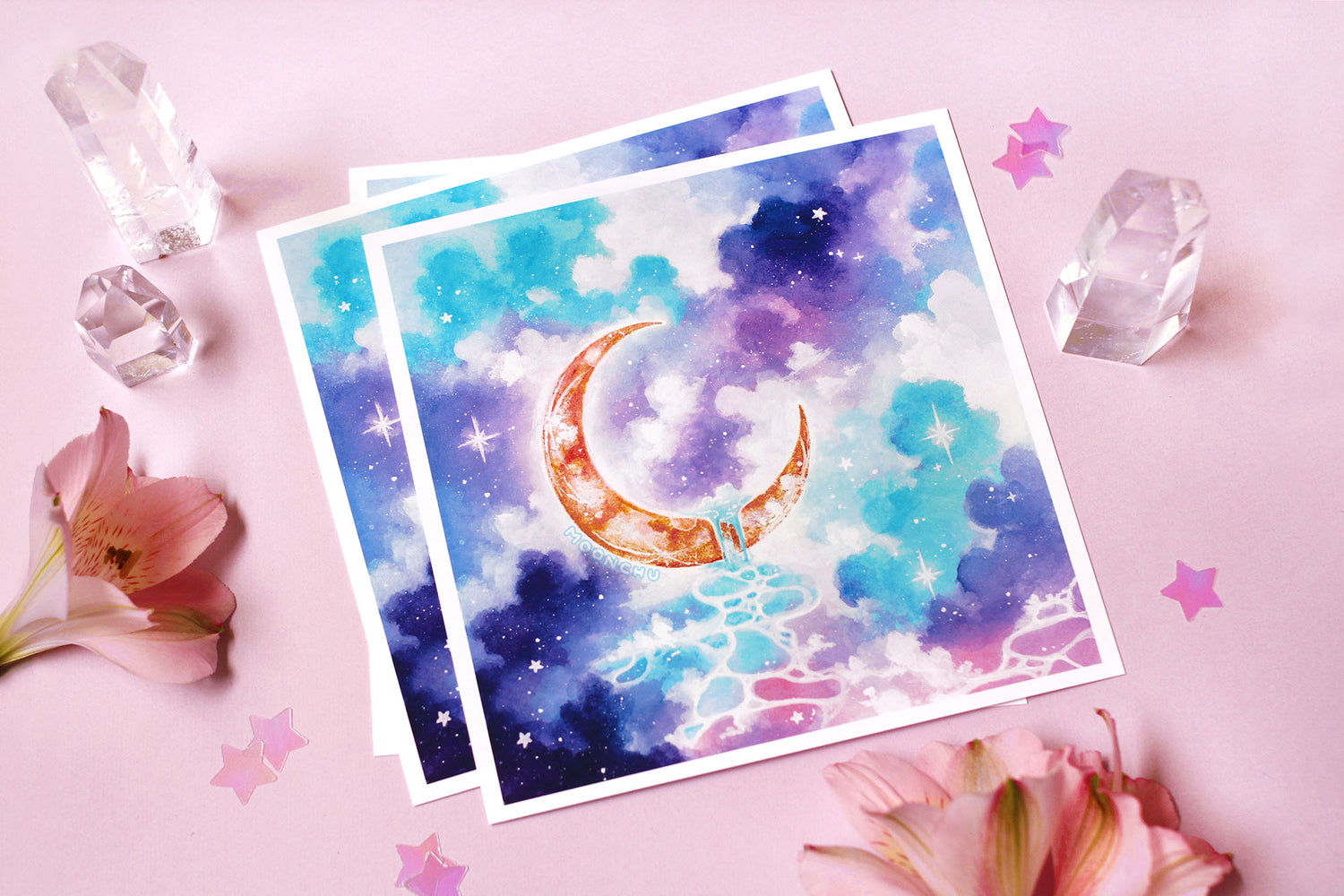 "rivulet" depicts a golden haloed crescent moon hovering above a dreamy pastel sky, overflowing with glistening water. winking stars float within cool-toned clouds.