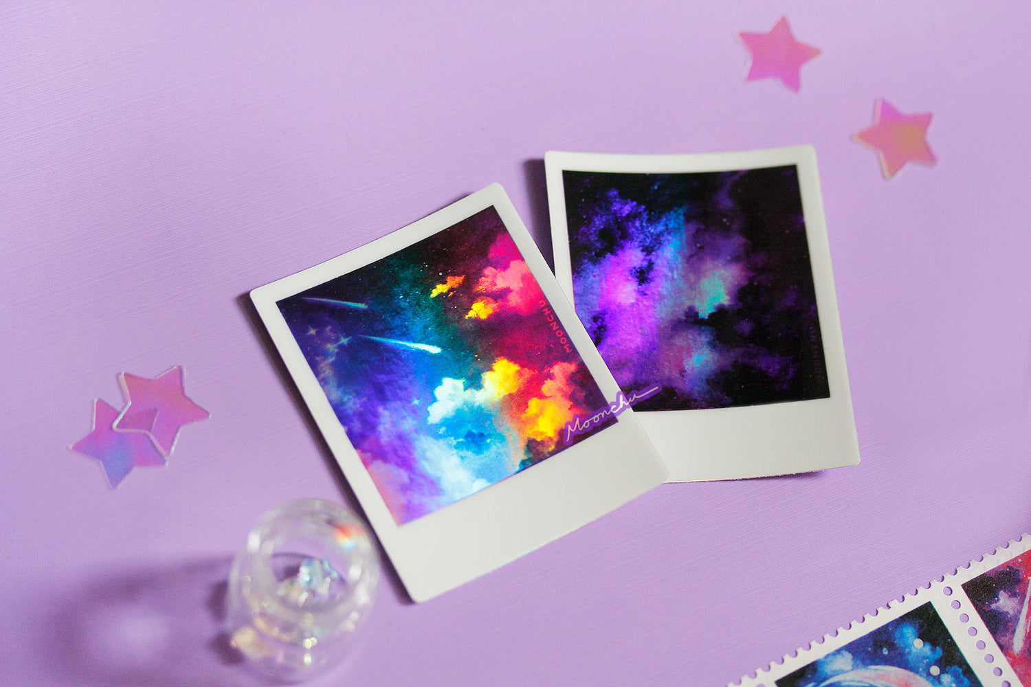 this sticker is a holographic space dream encased within a photo frame, perfect for a bit of every day magic. looks great on water bottles, computers, planners, or just hanging out on your desk as a mystical reminder.