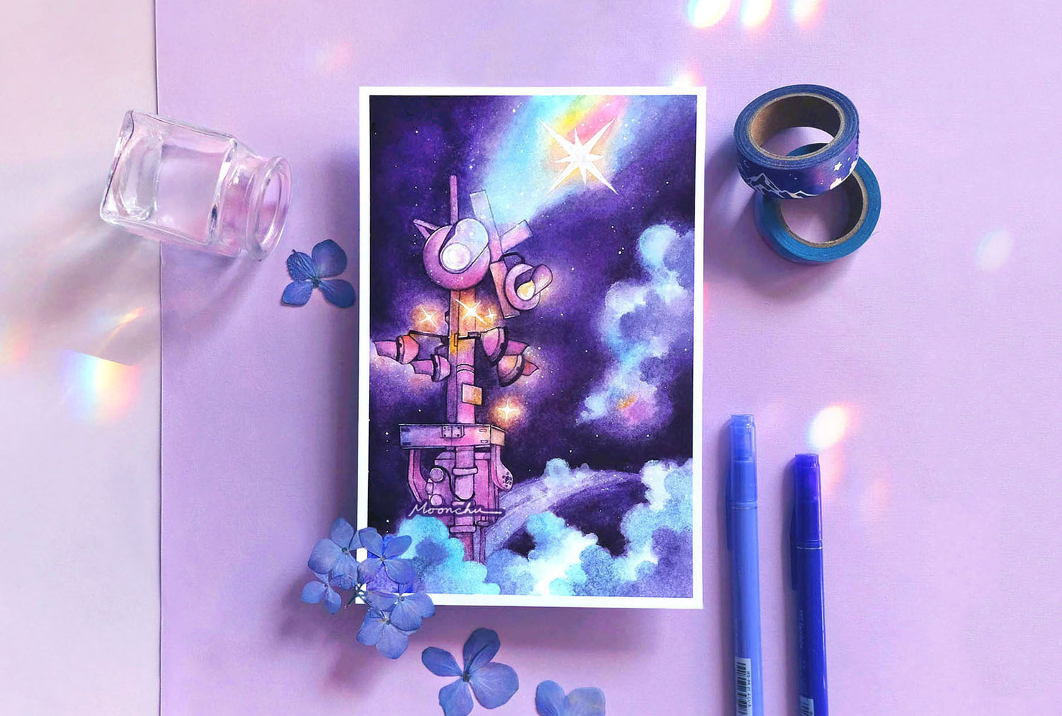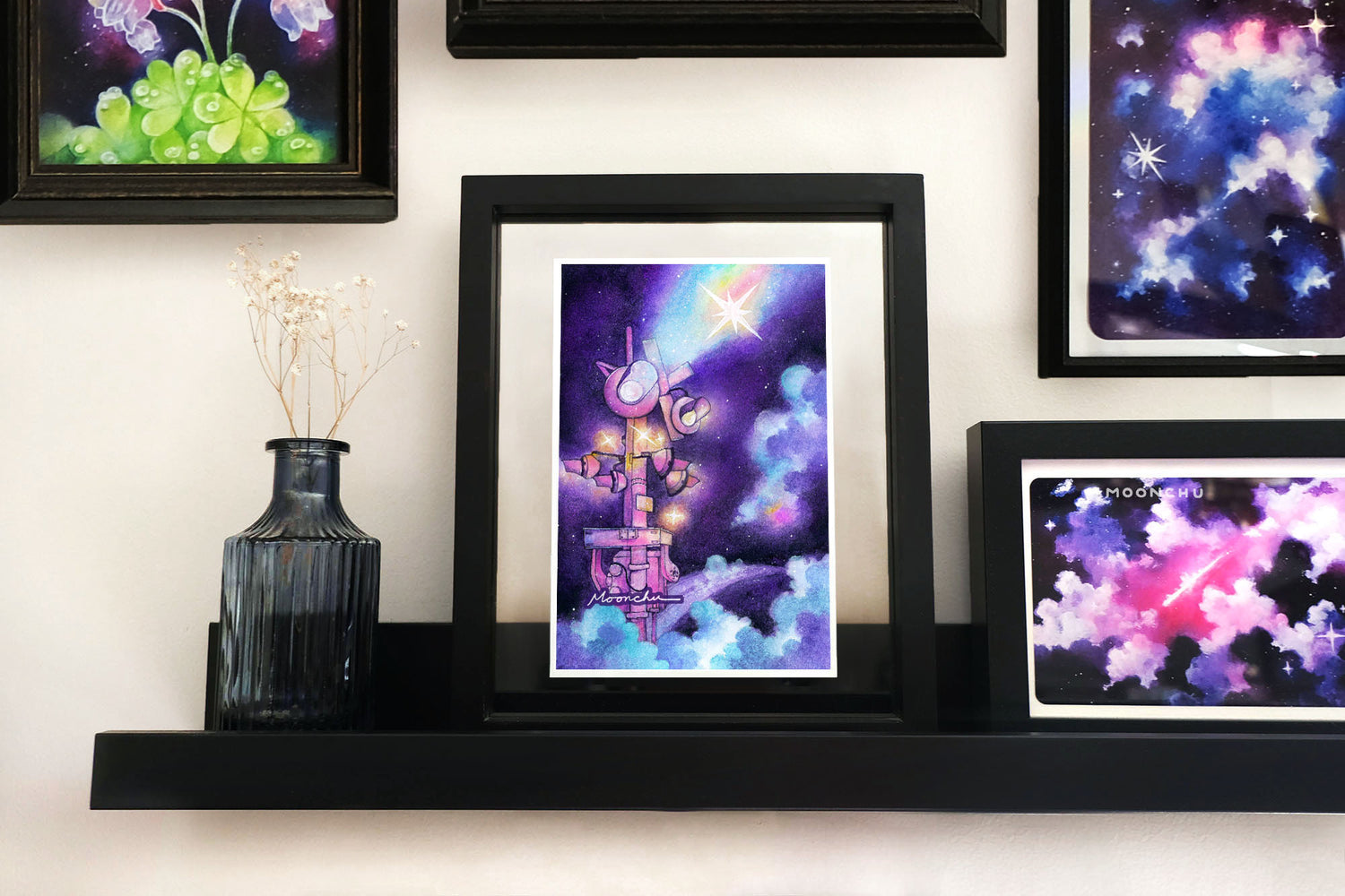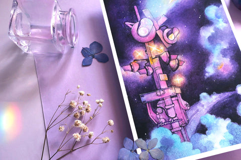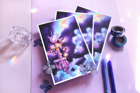 a loving long distance art print depicting a train-track signal shining in space with pastel blue clouds.