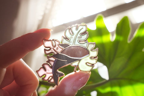 sleeping under the monsteras whale enamel pin, monstera leaf pin, plant whale pin