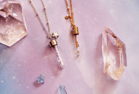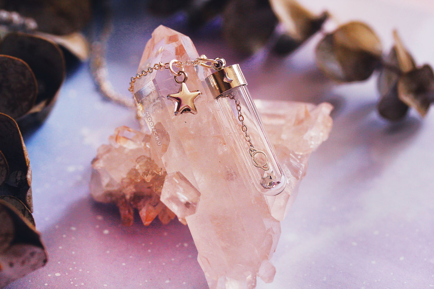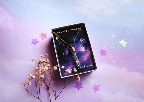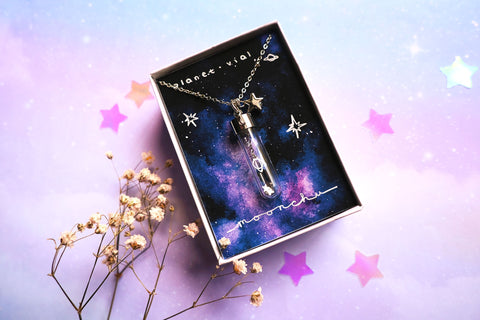 - sweet silver planet with iridescent stars suspended in a glass vial
