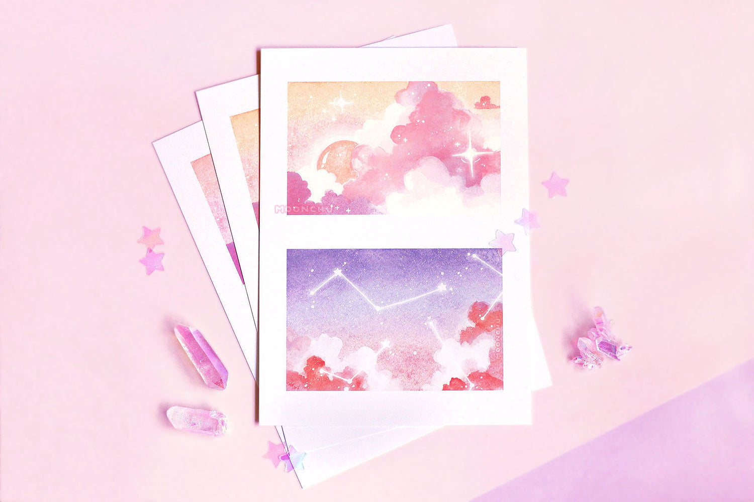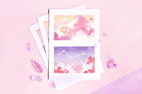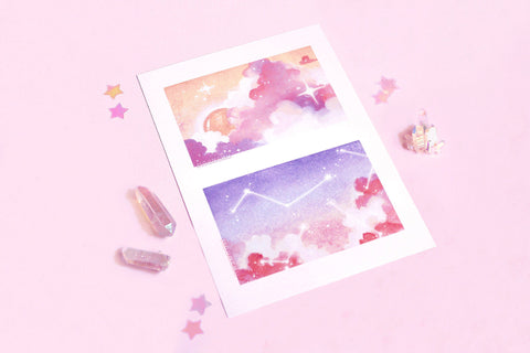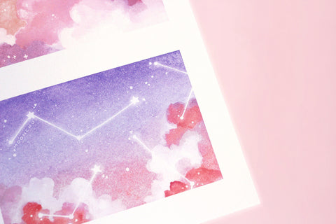 a two panel pastel dream print - top panel depicts a tangerine sun nestled within a warm bed of clouds, bottom panel illustrates glowing constellations hovering within a purple/blue toned sky.