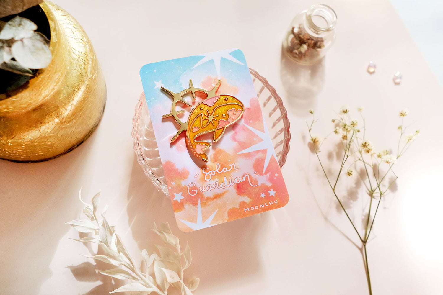 sun guardian whale enamel pin, sun whale pin, space whale pin