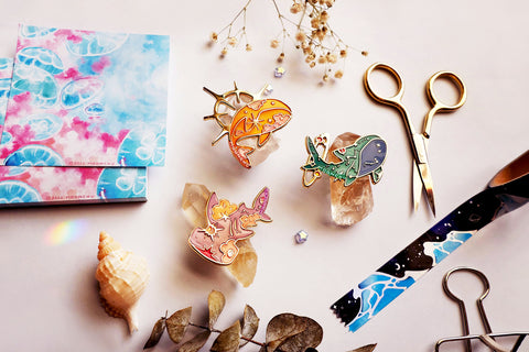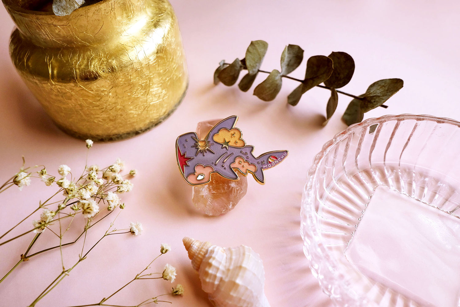 a galactic, original art enamel pin companion for shark lovers and nautical friends.