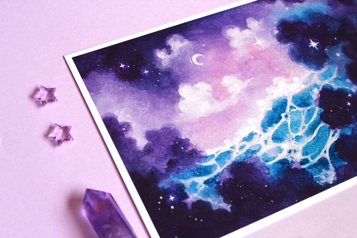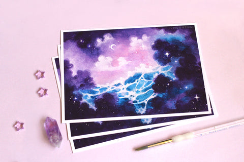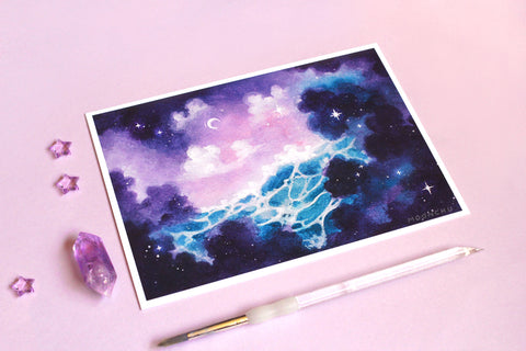 depicts a very plush purple cloudscape misting around a vibrantly teal and tumultuous ocean. a small waning crescent moon overlooks the surge of the tide as small stars suspend in the sky.