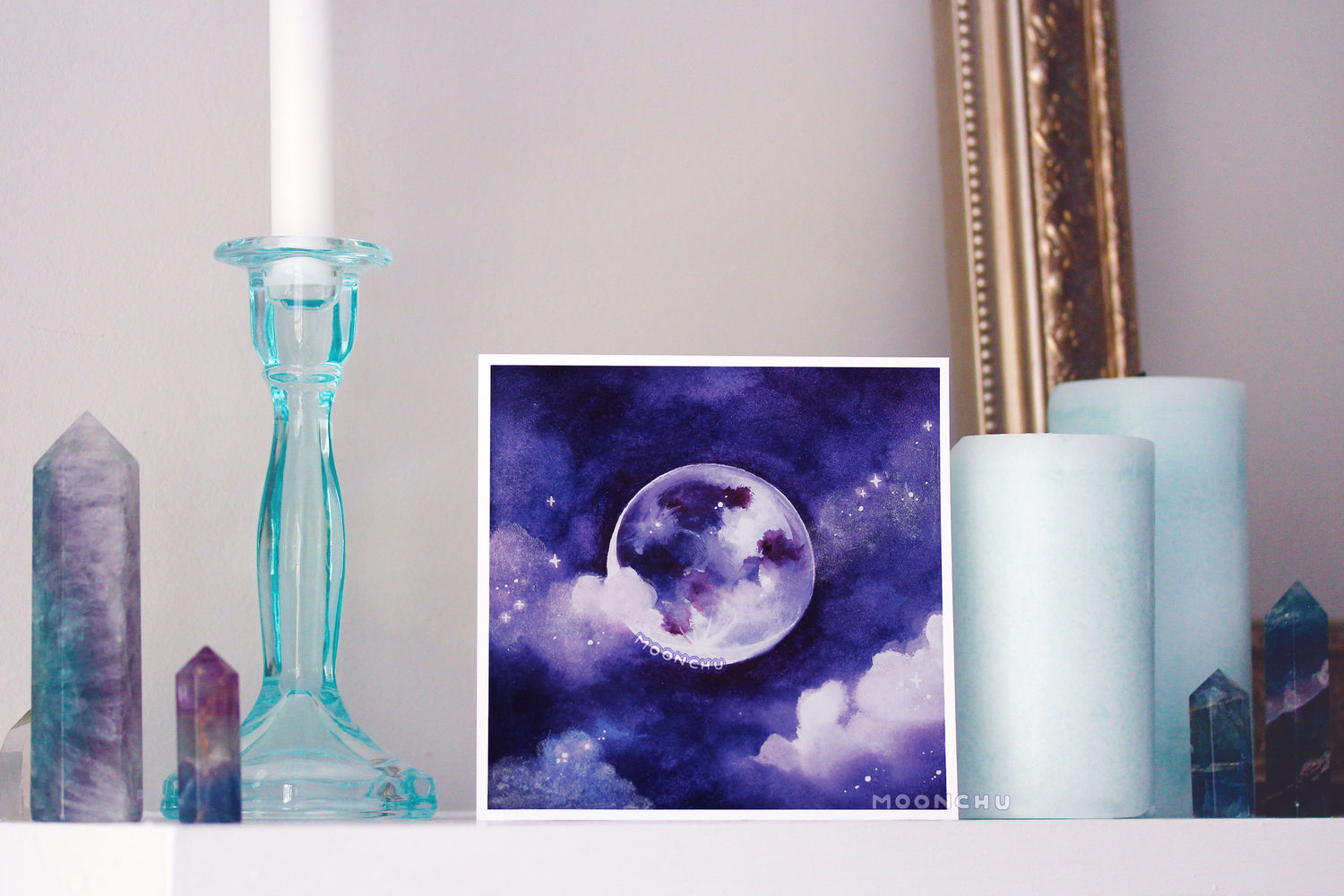 originally a watercolour painting, this print depicts a velvety blue, deep sky with a glowing moon. who can say what lies within the deep magenta moon craters?