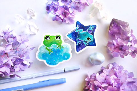 very cool space frog surfing on a star die cut vinyl sticker, original frog illustration