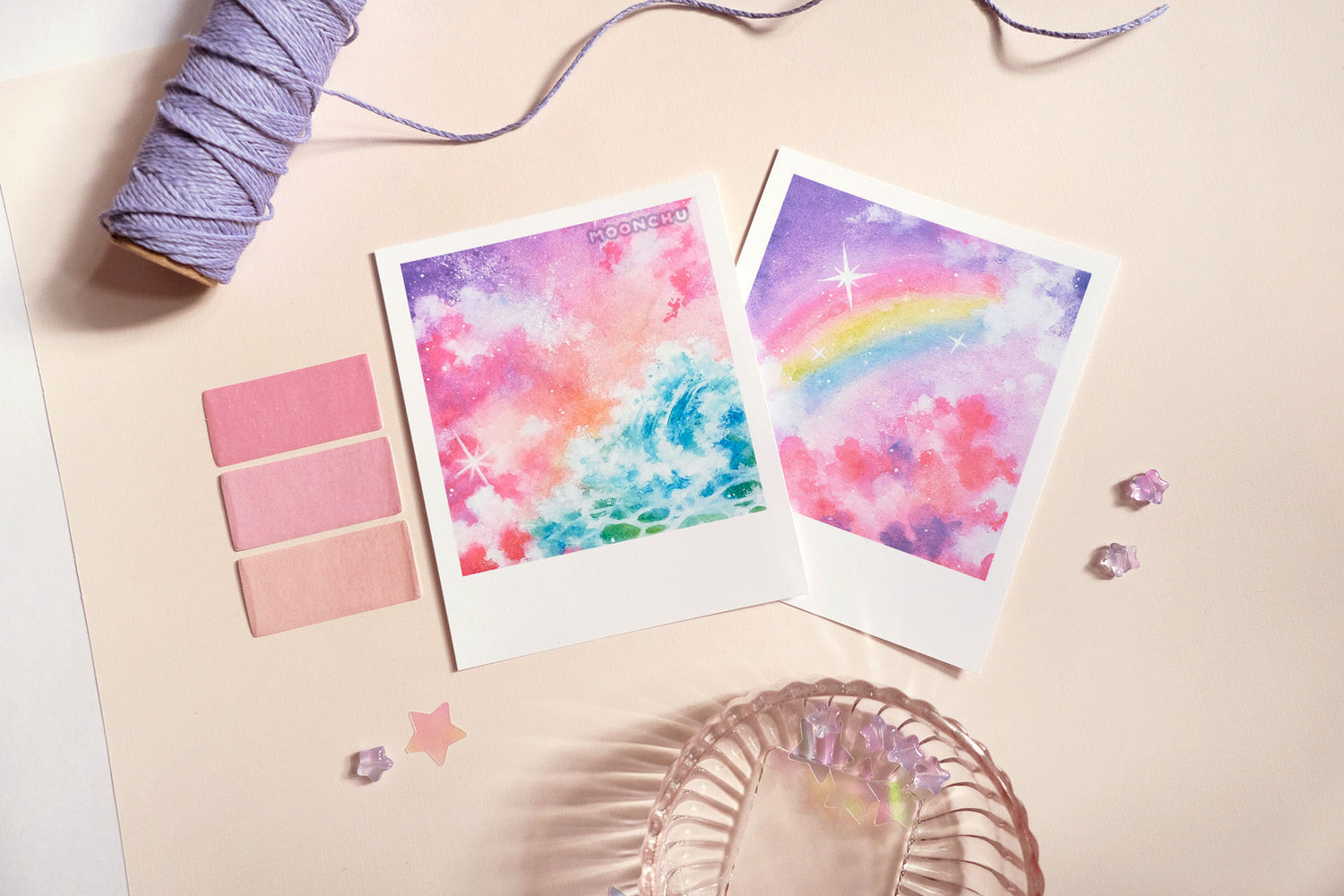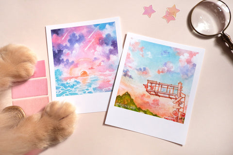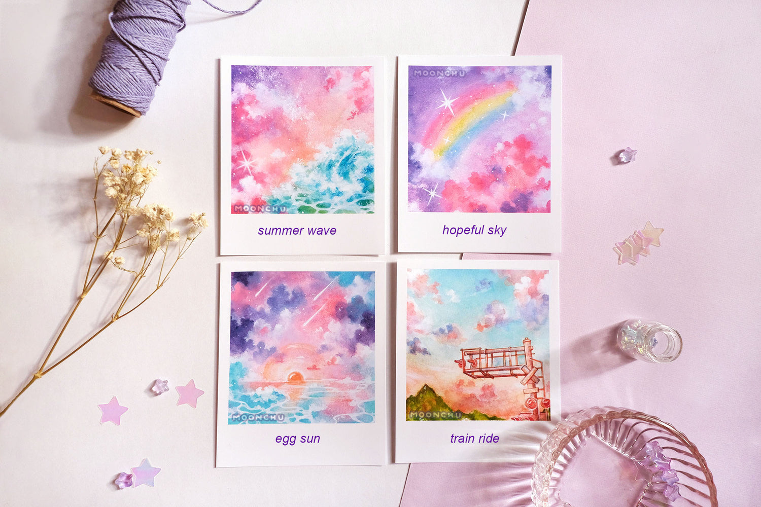 inspired by real life photographs and based off of original watercolour paintings, these snapshots would look neat in a bujo journal or hanging from fairy lights in an office or bedroom wall. dreamy little art prints for your pastel wall fantasy.