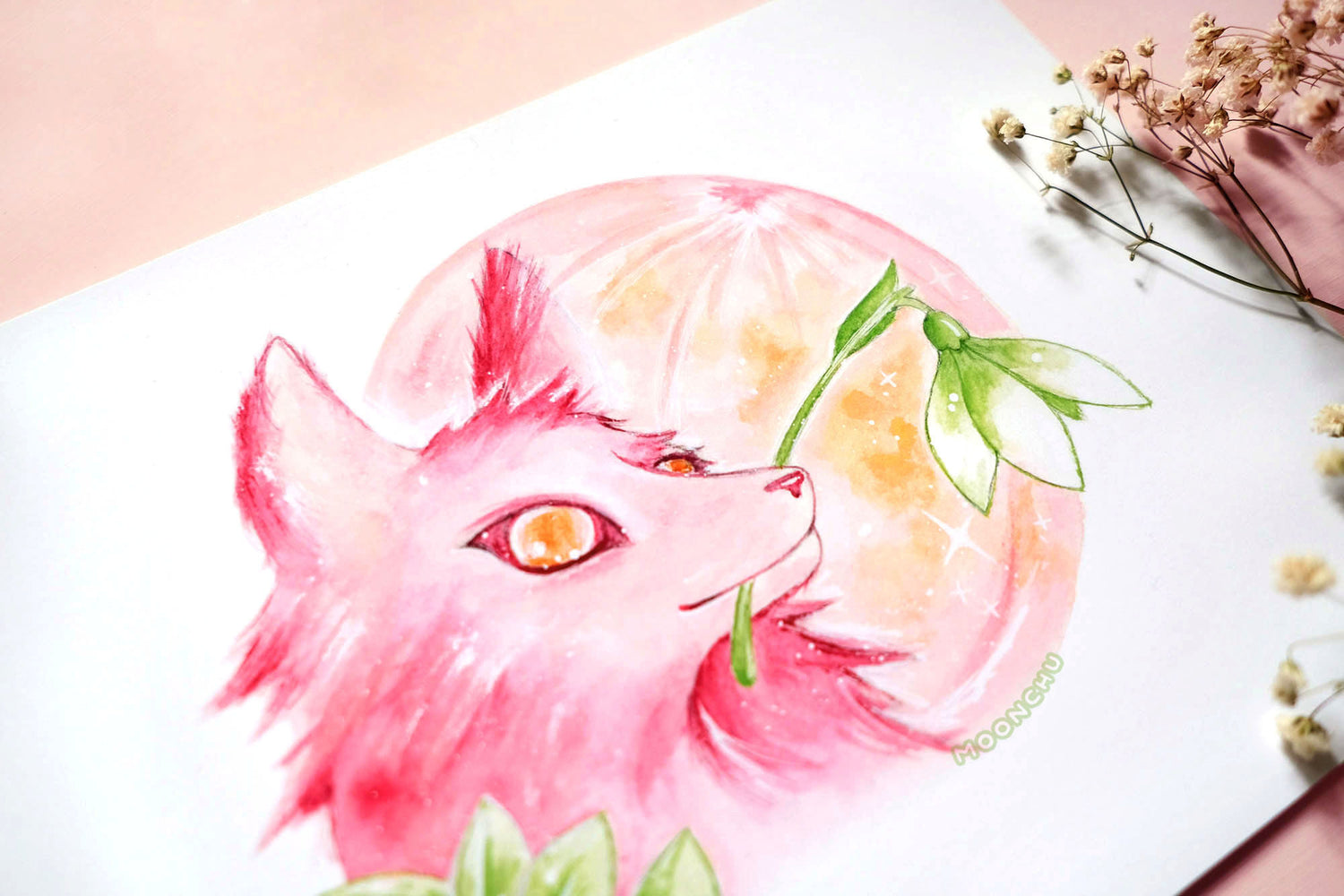 he kind of looks like a fox, but it's okay - any fox lover or wolf lover can appreciate this moon familiar~ with a floral snowdrop gift within his mouth. this magical moon art print is based off of an original watercolour painting.